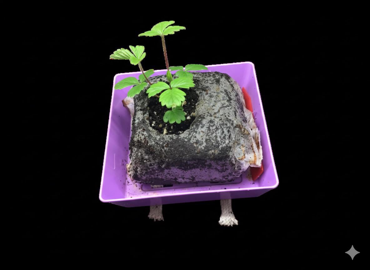 高山イチゴの新しい栽培方法を試しています。この植物はFragaria vesca ‘Waldsteinchen’です。一般的なアルパインよりも小さいため、「ミニレッド」とも呼ばれます。最初はエアロガーデンで発芽、栽培され、最近 80 mm の Jiffy coir Growblock に移植されました。 5にあります" ×5" トレイの穴に2本の綿芯が織り込まれたマイクログリーントレイ。小さなトレイを大きなトレイに置くと、自動的に水が供給されます。浅い 1020 トレイには、これらの小さなトレイが 8 つ収納されます。