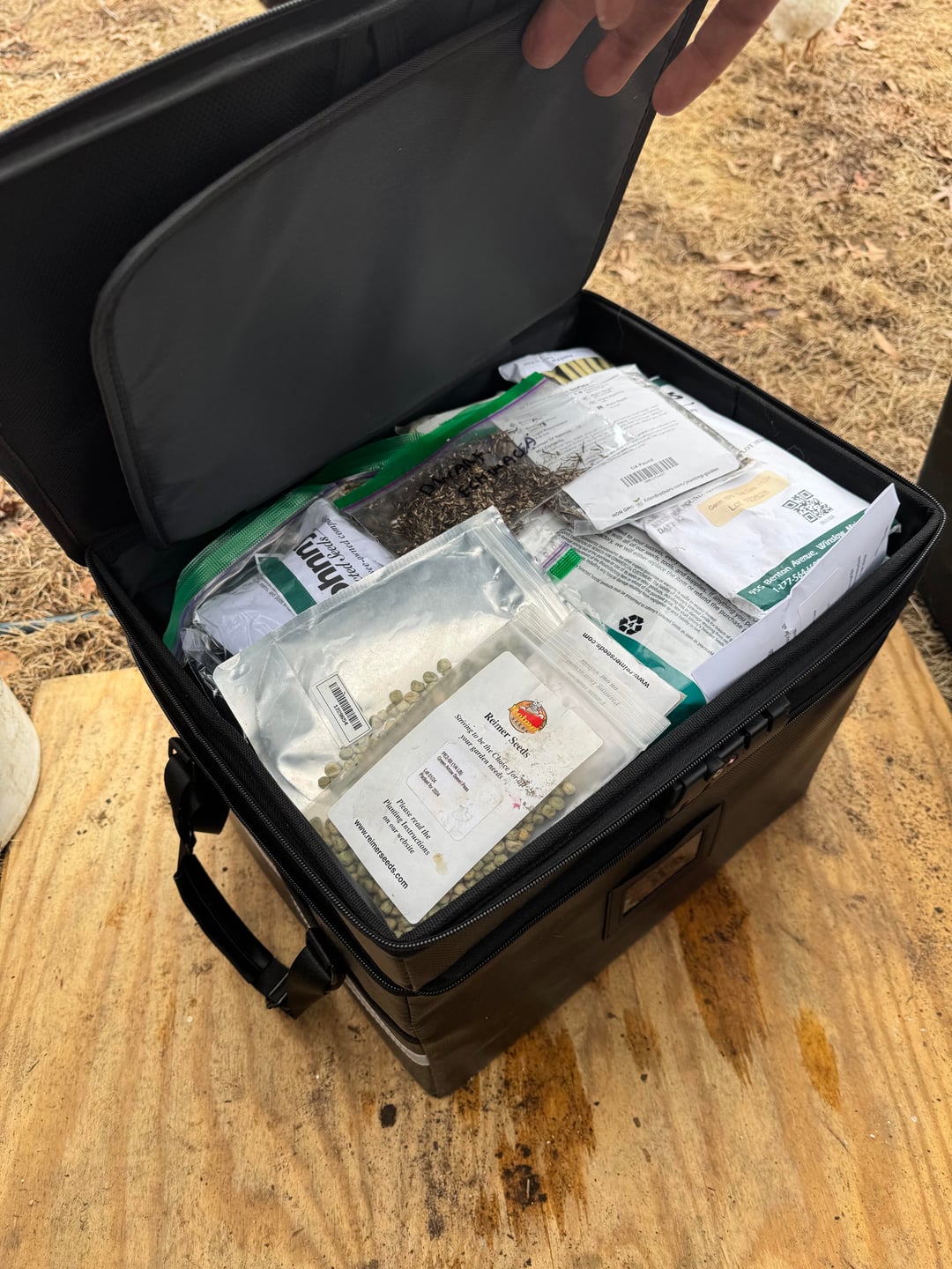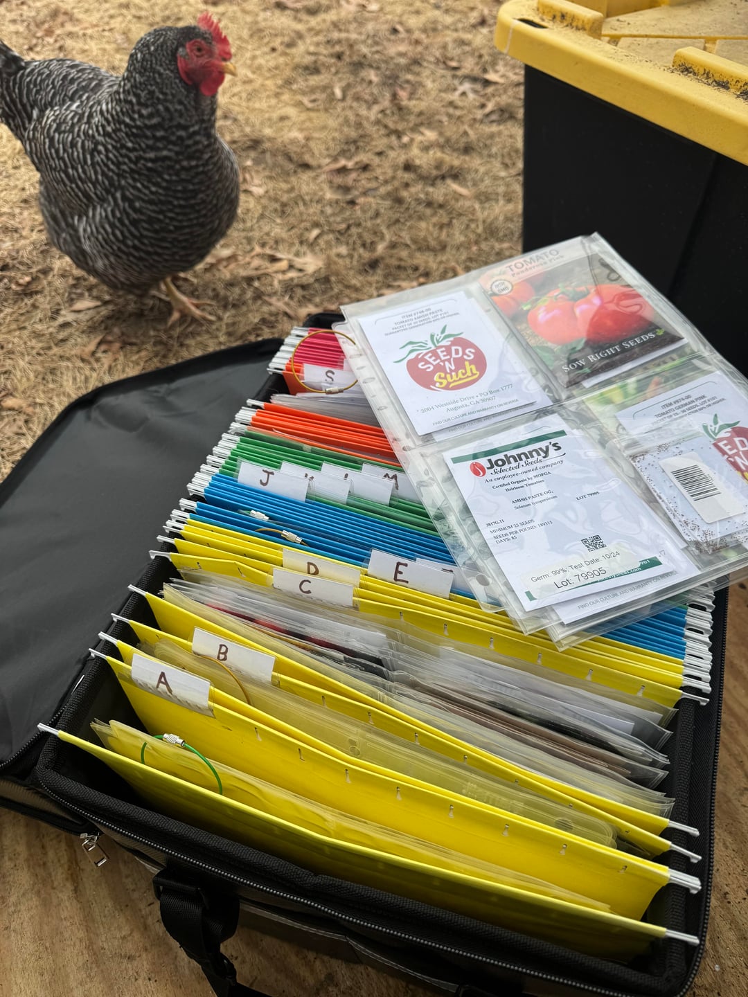 私はアマゾンからこれらのファイルボックスを入手し、キーホルダーのループで隅に綴じられた種子のパケットに写真スリーブを使用しています。エンドウ豆、トウモロコシ、豆などの大きな種子は上部に簡単に収納でき、マーカーや種子ラベル、その他必要な備品も収納できます。