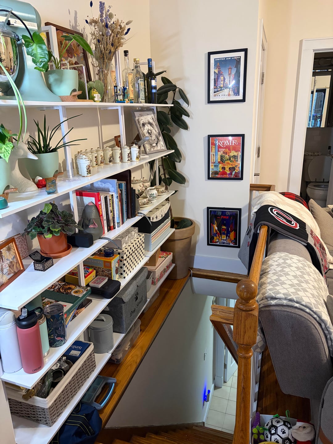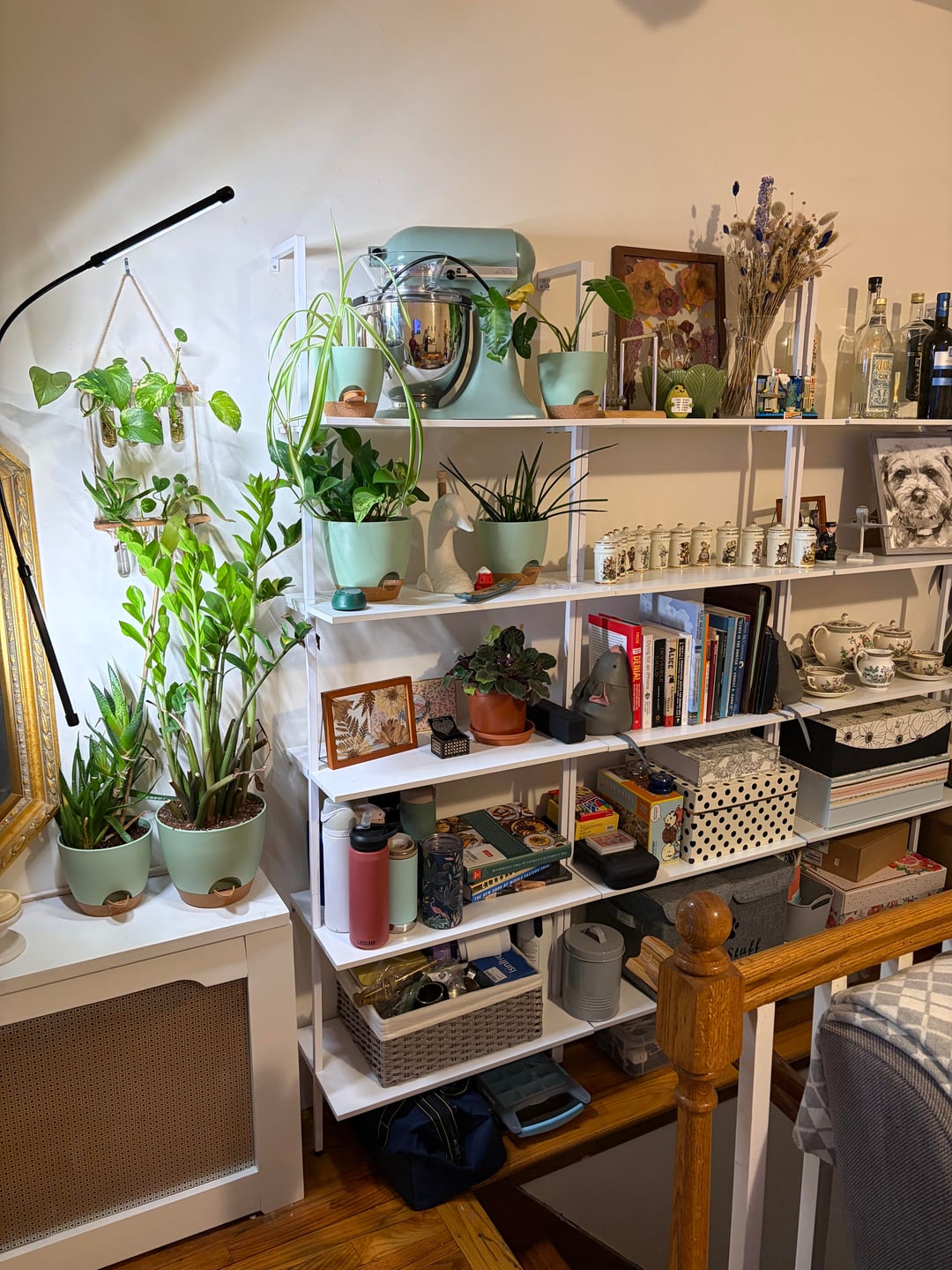 隅に詰めていた巨大なゴムの木を拾ったところです。私のアパートにはあまり光が入りませんが、メインの引き戸からは光が入ります。私はすべての植物を棚に並べており、ほとんどは育成ライトの下にあります。私の問題はコンセントが足りないことです 😅 電池式の栽培ライトを購入して、階段の一番上の手すりに植物の方向に向けて取り付けようと考えています。私の心配は、その距離からでは十分な光が得られないことです。何かアドバイス/ヒントはありますか?