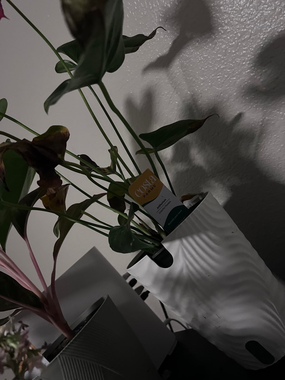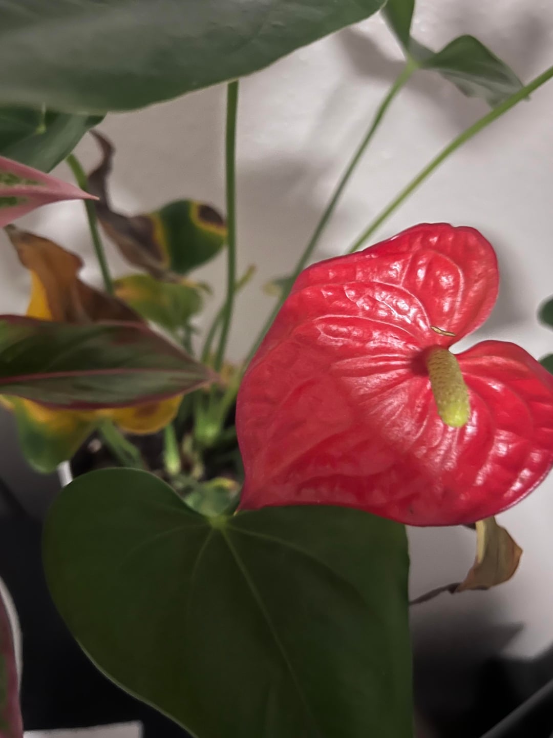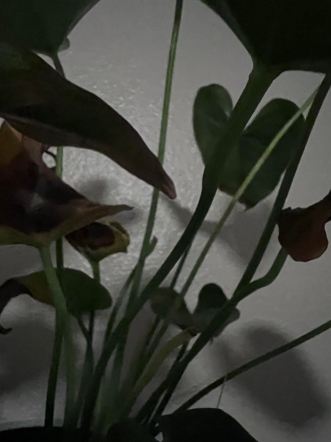 こちらの葉は茶色くなってきました。絶対に水をかけすぎないようにします。私はどちらかというと水中派です。もっと湿度が必要かどうかわかりませんでしたか? (それが置かれている部屋の周囲湿度は約30%です)しかし、一部の葉はかなり早く茶色くなっています。 (アザミウマだとは言わないでください。見ましたが、まったく見つかりませんでした 🥲) その隣の植物 (アグラオネマ) は元気のようです。