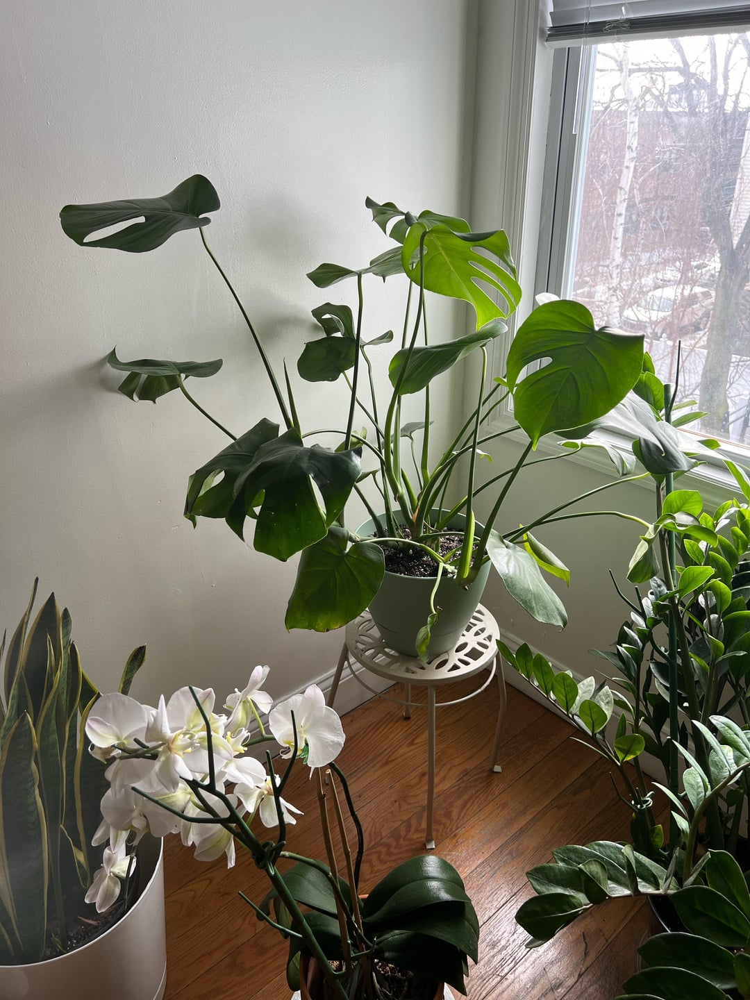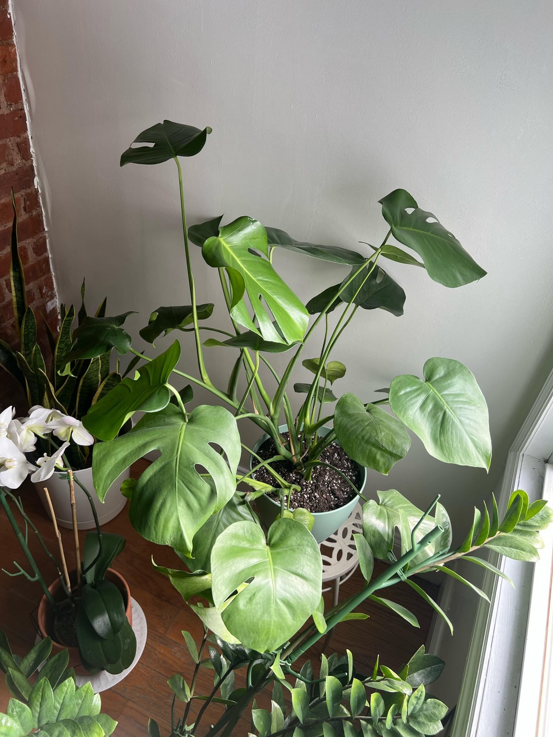 まず、植物は健康です。 8ヶ月経った今でも新しい葉が育っています!それは私が購入した最初の植物で、植物に本当に利益をもたらすように思えた豪華な自動給水ポットの1つに自分で植え替えなければなりませんでした。