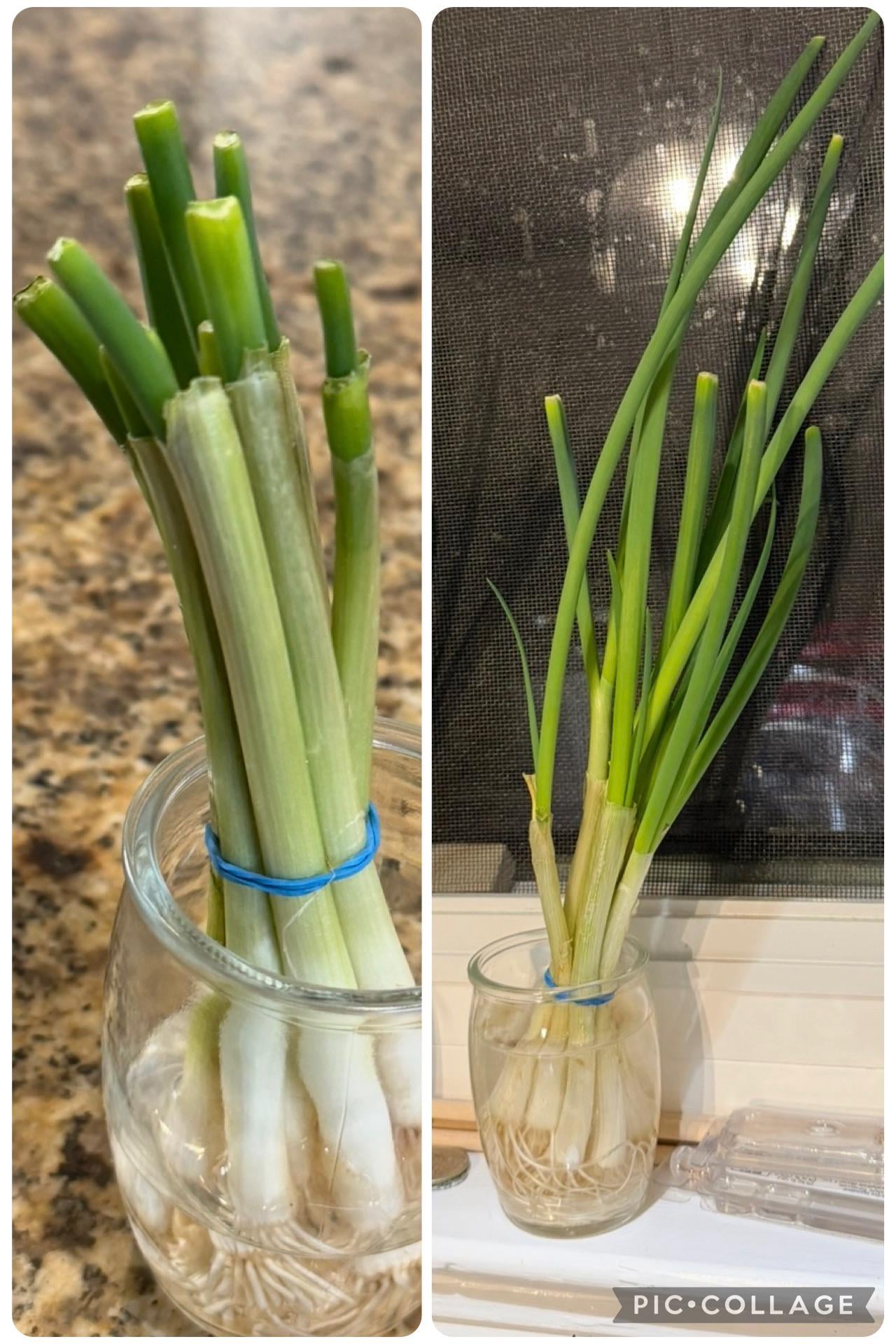 それで先週、ネギは伸びるのがとても早くてすぐに伸びるということを知りました。これは 2 日分の成長と 1 週間後の成長です。それは今私の新しい観葉植物であり、無料のネギに本当に興奮しています。私は料理するものすべてにそれらを置きます😅