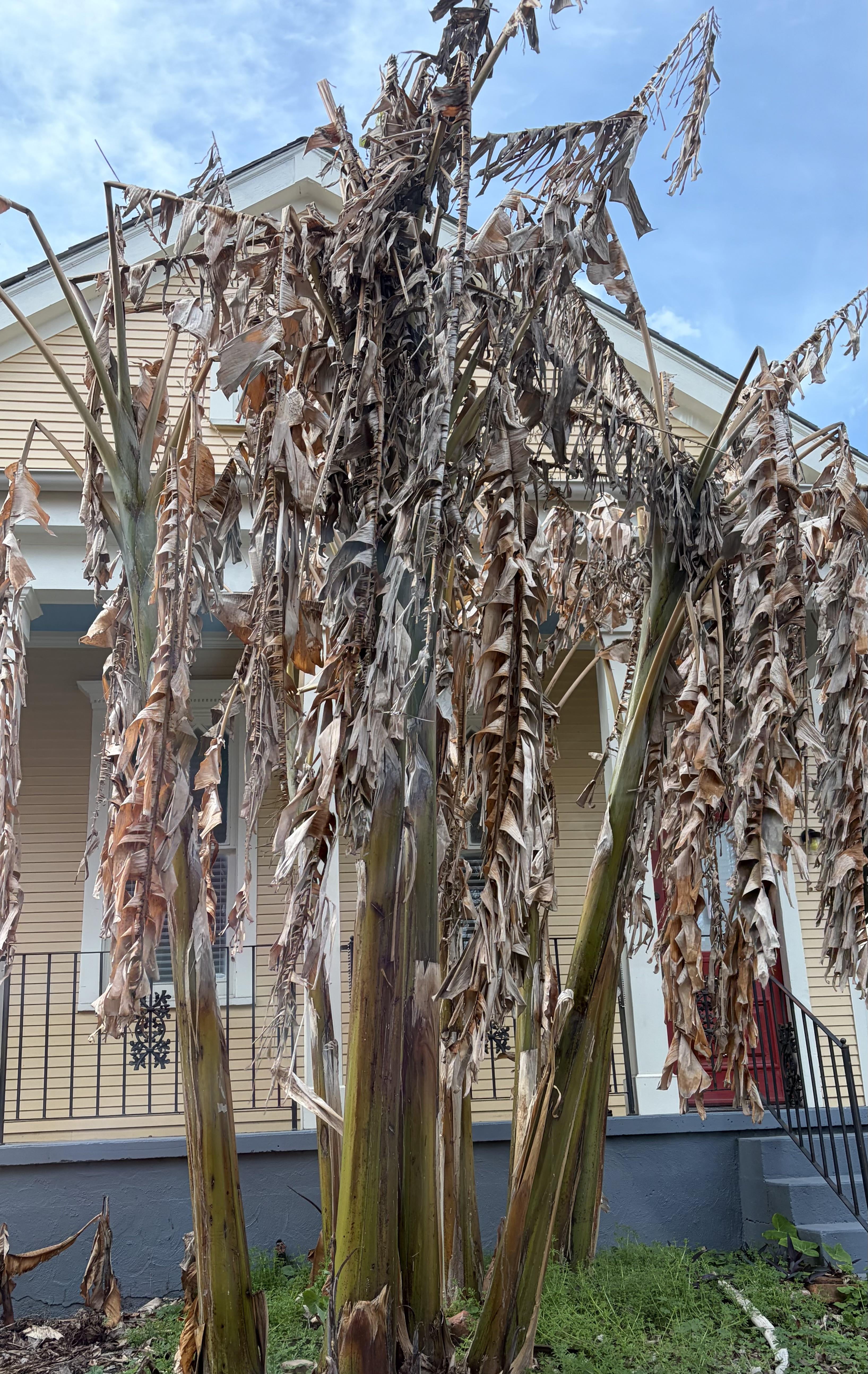こんにちは皆さん、私はガーデニングについては何も知りません。私が最近引っ越してきた場所には大きなバナナの木(だと思う?)があります。私はニューオーリンズに住んでいますが、数週間前には氷点下の気温が続きましたが、残念なことにそれは残念なことに一致しませんでした。クリーンアップに賢明に対処する方法を教えてください。枯れた茎はそのままにしておいたほうがいいでしょうか?助けてください!芝生スタッフの協力が必要な気がします 😵💫 ありがとう!