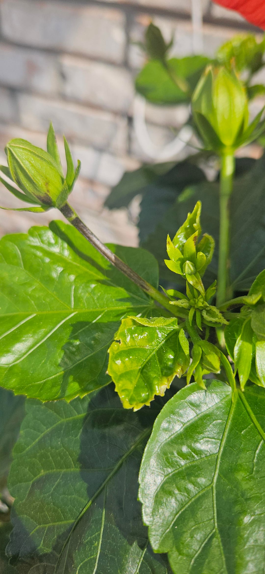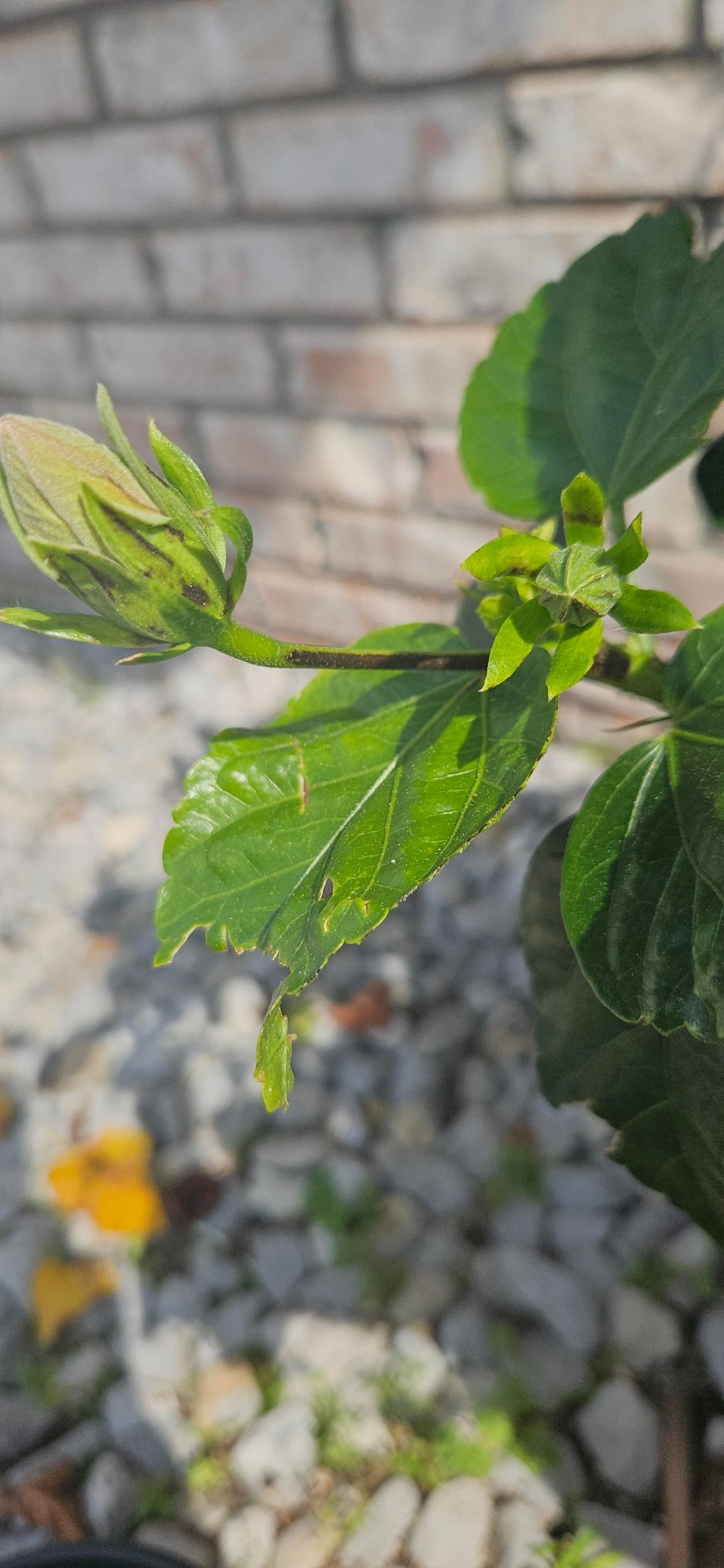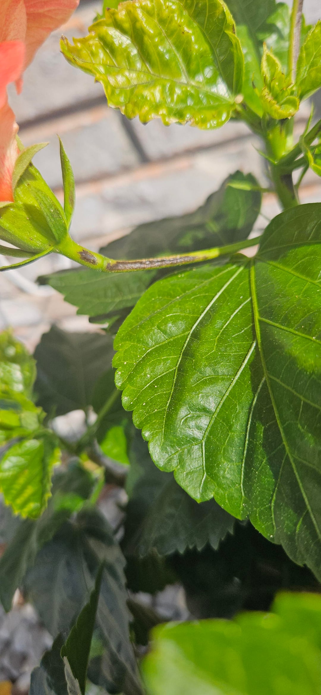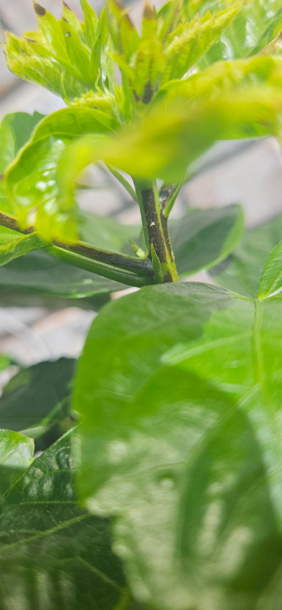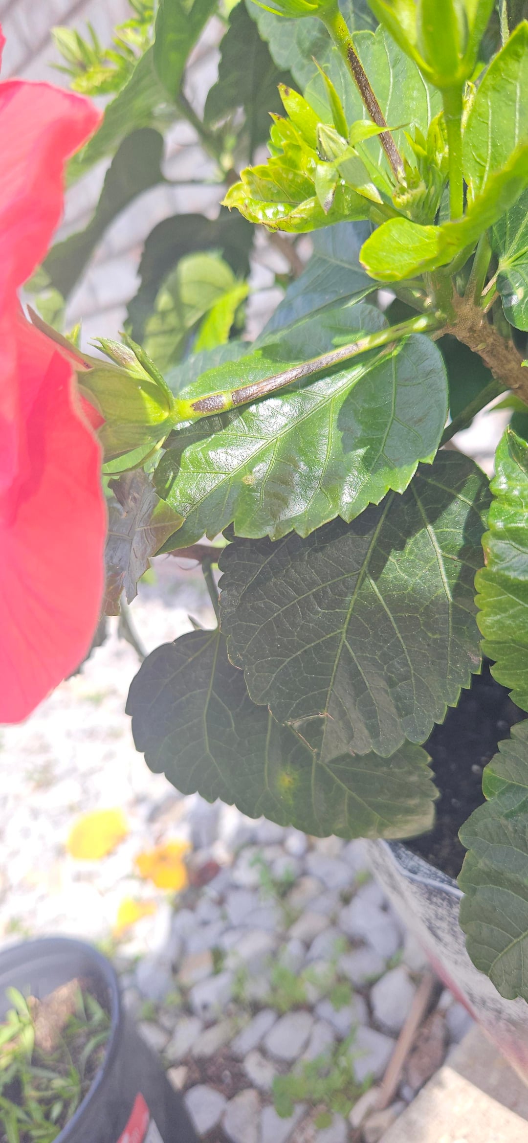 このトロピカルハイビスカスを約1年前から育てているのですが、ここ1週間ほどで茎に黒い斑点があることに気づきました。自然なものとは思えず、これらの部分を剪定するべきか、そのまま残すべきか迷っています。よろしくお願いします。