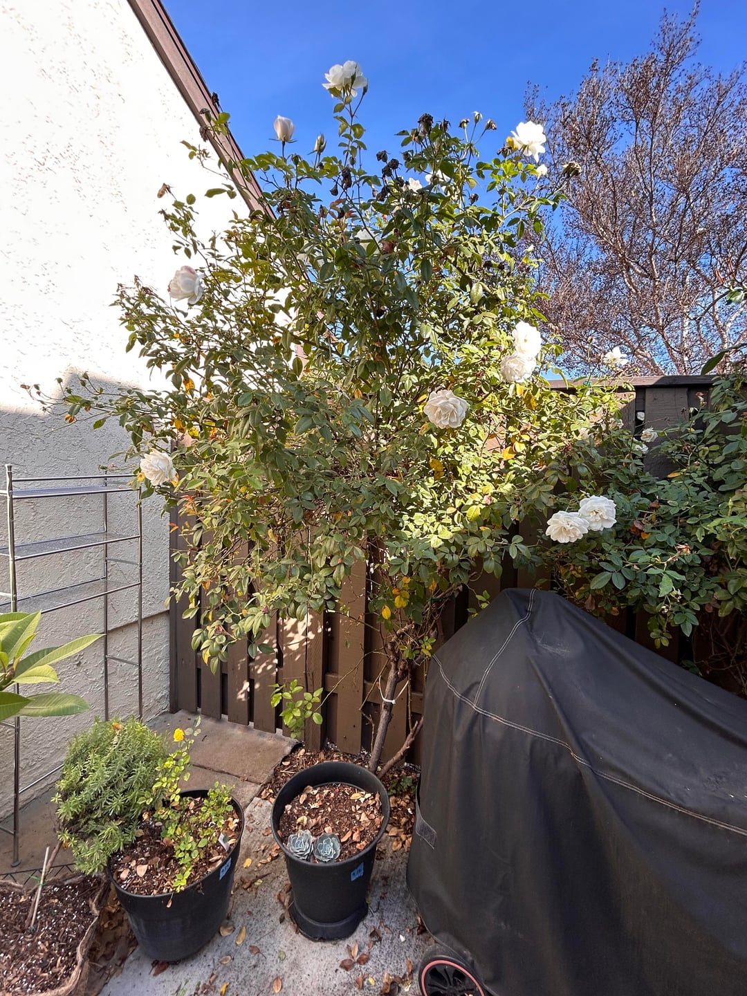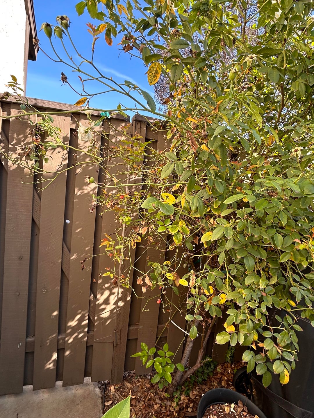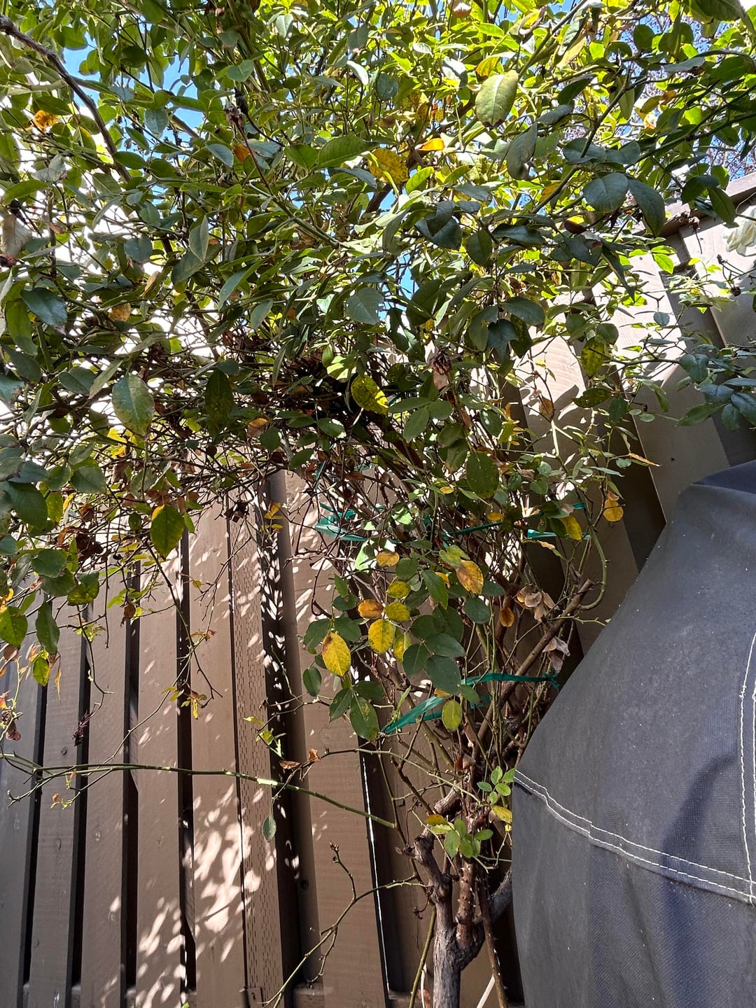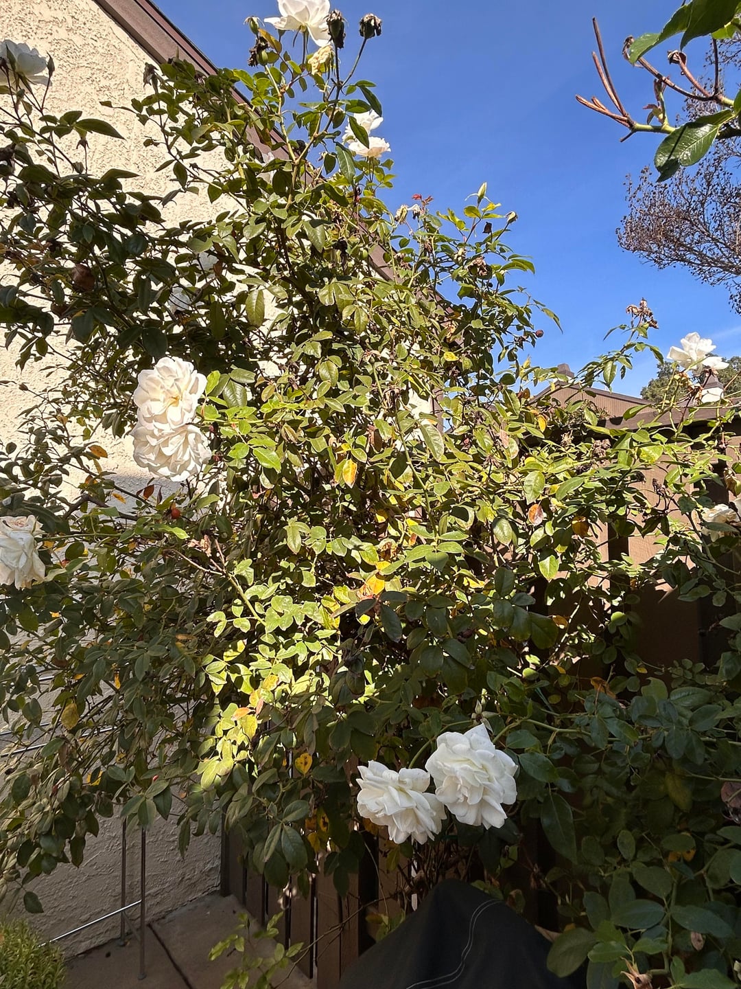 このバラの茂みは私が引っ越してきたときにここにあり、素晴らしい花を咲かせるので、縛って手放すことにしました。制御不能になったのでトリミングしたいのですが、途中で誤って殺してしまいたくないのです。これに対処する方法について何か提案はありますか?写真が役に立つかどうかはわかりませんが、