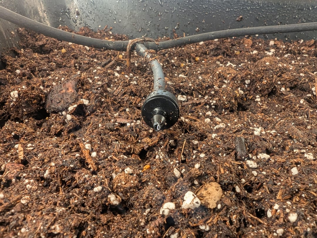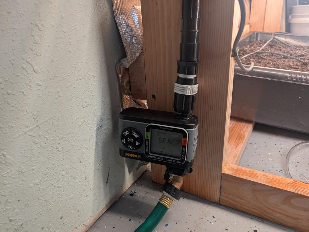 屋内菜園を設置し、1/4を数本使って幹線を走らせています。" 各ビンとプラントにティーを接続します。私はタイマー、25 PSI 圧力調整器、および 1 GPH ドリップエミッターを使用しています。
