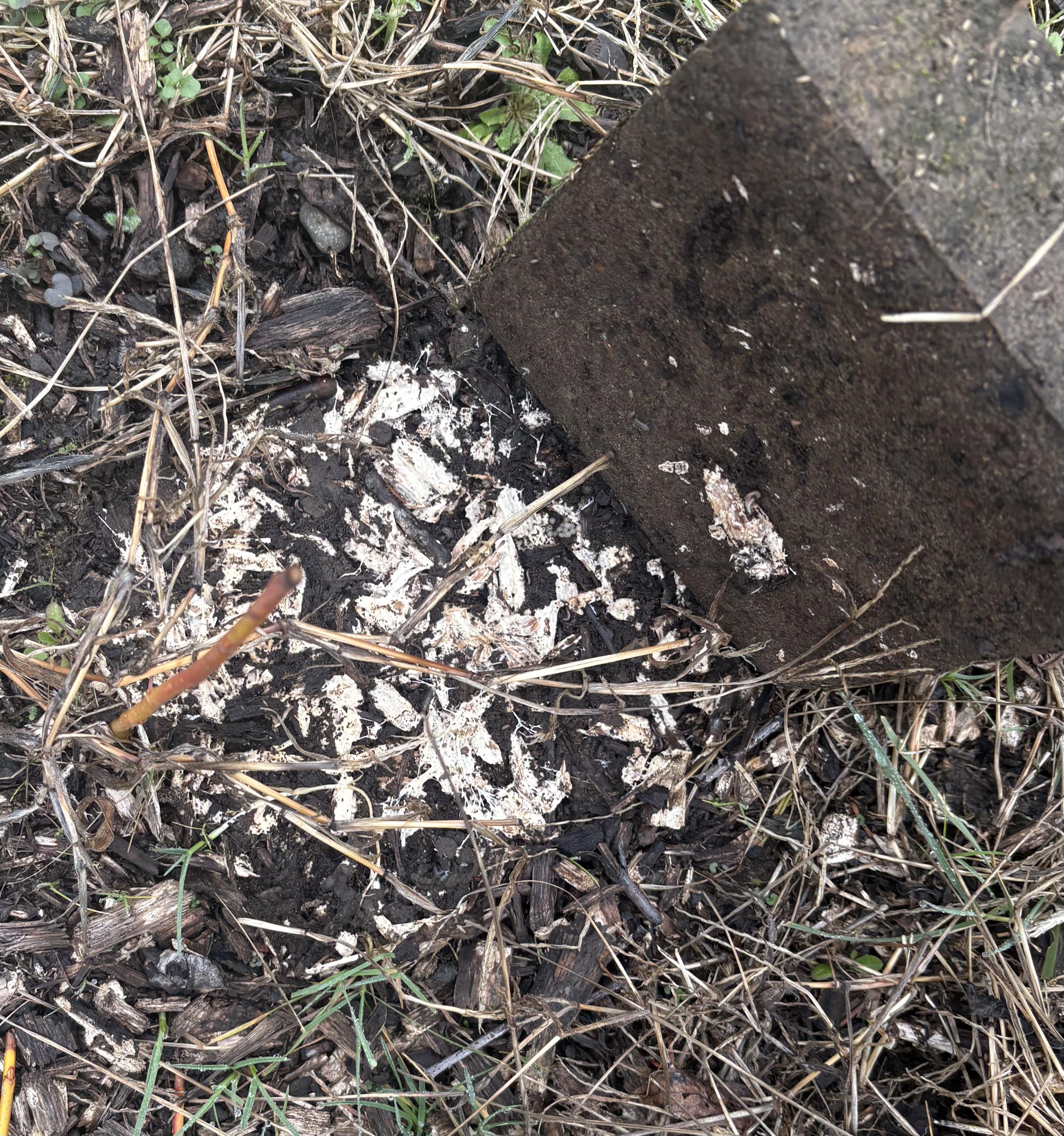 初めてのコミュニティガーデンの区画を手に入れ、準備手順を評価しました。敷地の真ん中に古い入札が残したレンガがあります。この白いものはその下にありますが、その集中領域の外には見えませんでした。これが何なのかについて何か考えはありますか? オレゴン州、参考になれば。