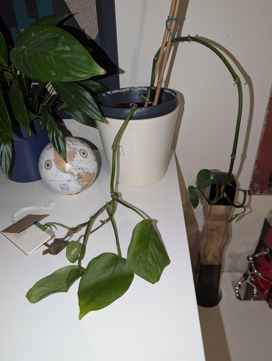 私は植物を育てるのが好きではありませんが、ゴールデンポトスは(大きすぎたので)フェアで剪定するまでは非常に順調に成長していました。文脈を考慮して、最初の写真ほど縮小しませんでした。それ以来、狂ったように葉を落とし続けています。