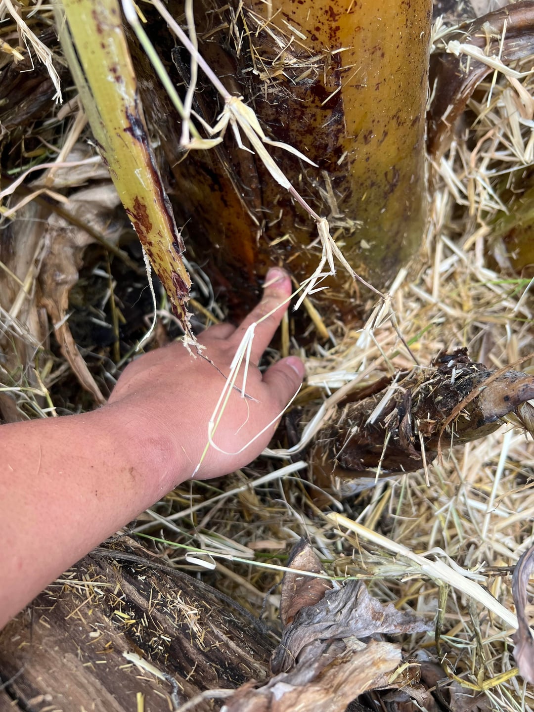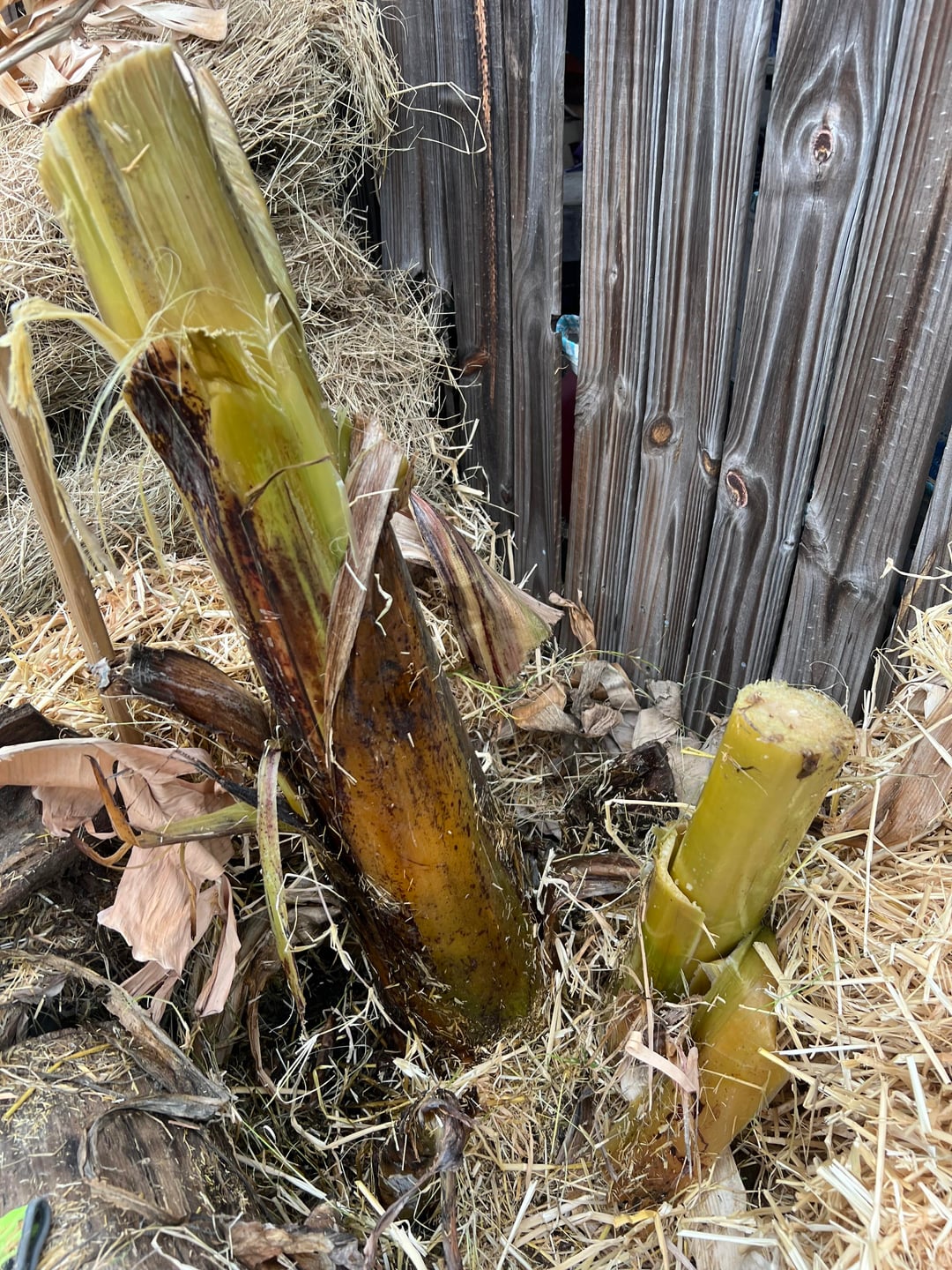 テキサス8Aダルズ。バナナの周りの干し草マルチを引き戻すことにしました。高さ3フィート、幅2フィートのマルチをプラスチックシートで覆います。触るとしっかりしていて、ベビーコーンは上部にダメージがあったものが2個ありますが、根元は硬いです。 2年目の2026年には実を結ぶことを期待しています
