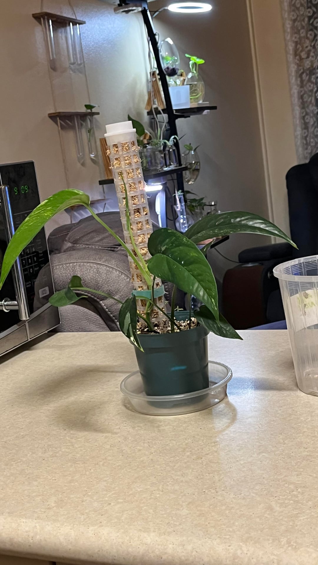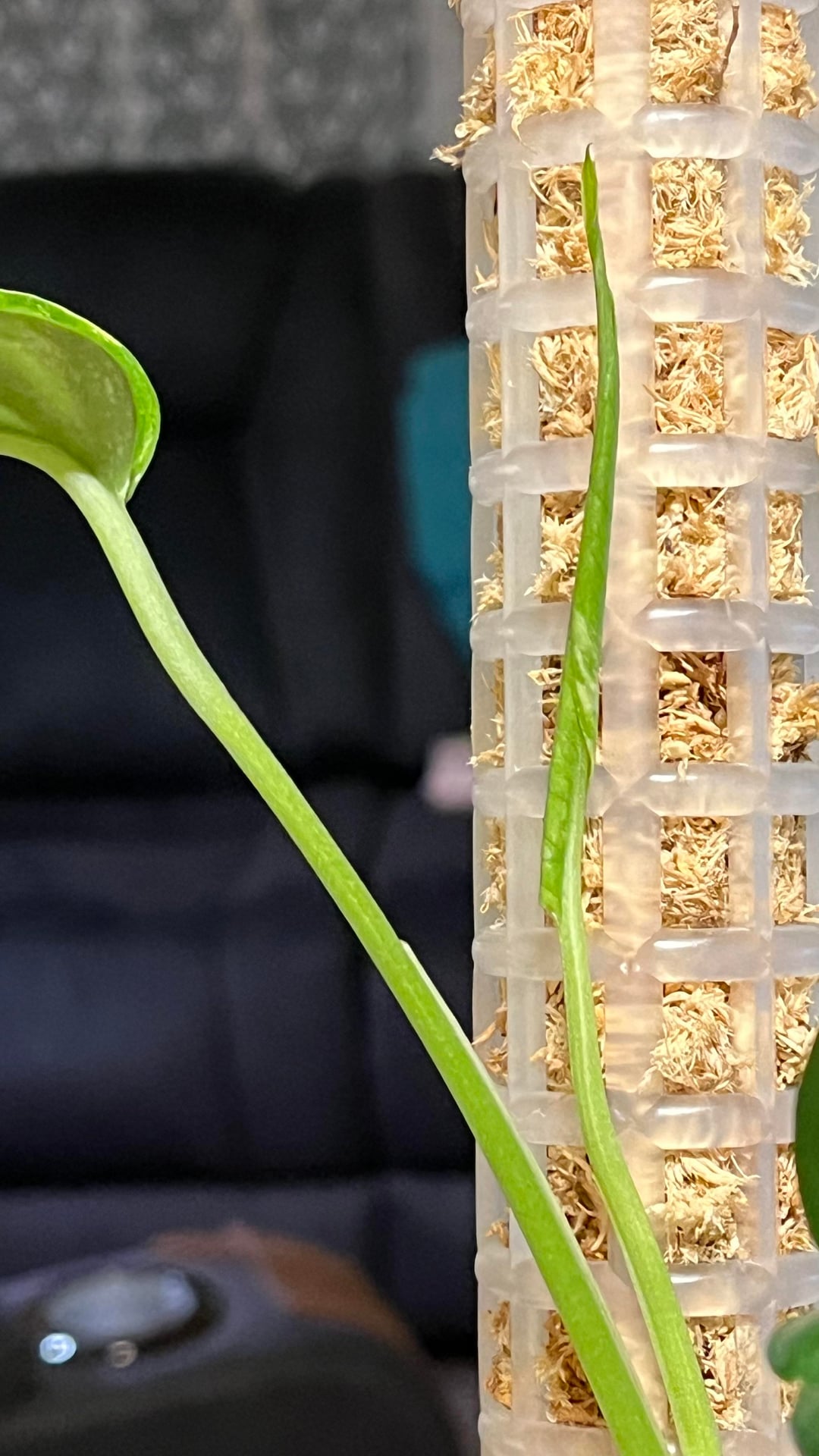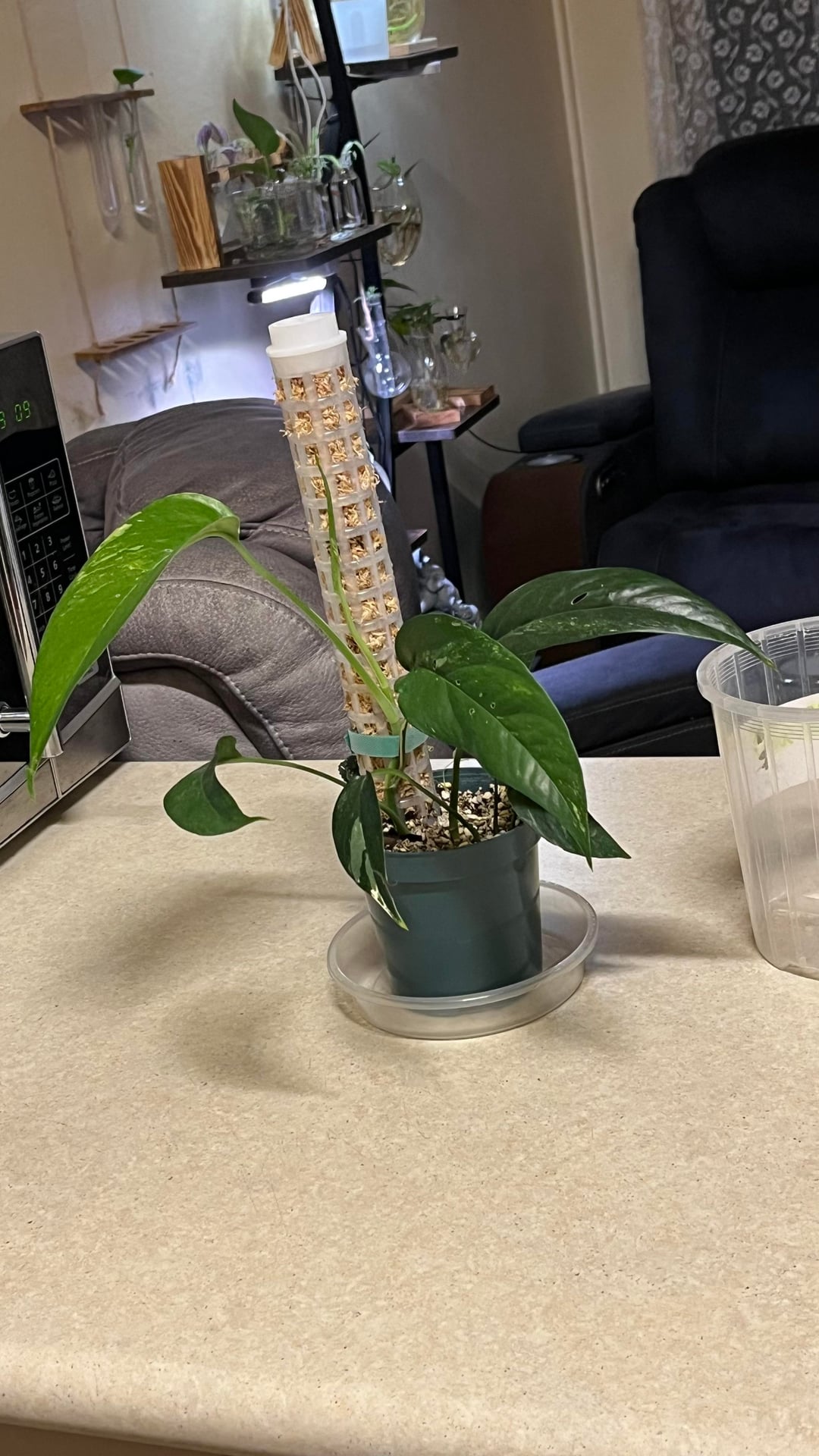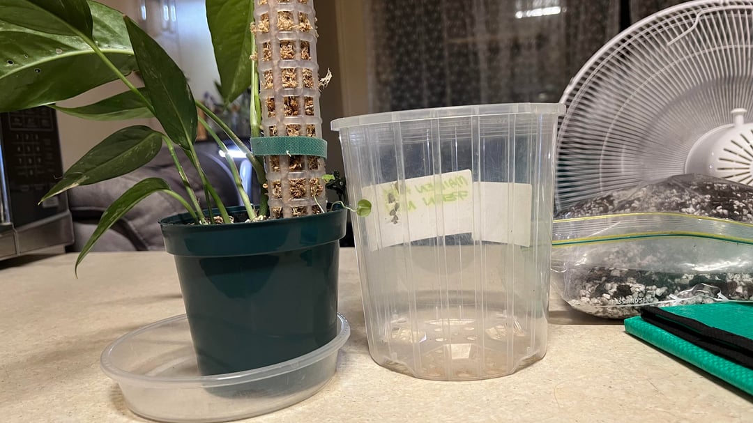 数週間前にこの植物を手に入れ、彼女は順調に成長し、新しい葉を2枚(完全に広げた)出し、さらに広げた葉も手に入れました…私は彼女に苗床のサイズから支柱を上げてほしかった(はい、苔が湿っていなければならないことは知っています)まだ水に濡らし始めていませんが、適切に登らせる前に次の植え替えを待っていました)私の質問は、彼女が今いる鉢のサイズに対してかなり小さいということです!苗床ポットからこのサイズになり、また部屋から出てきました。明らかに、彼女の根鉢が小さい場合は、まだ鉢を変えるつもりはありません…