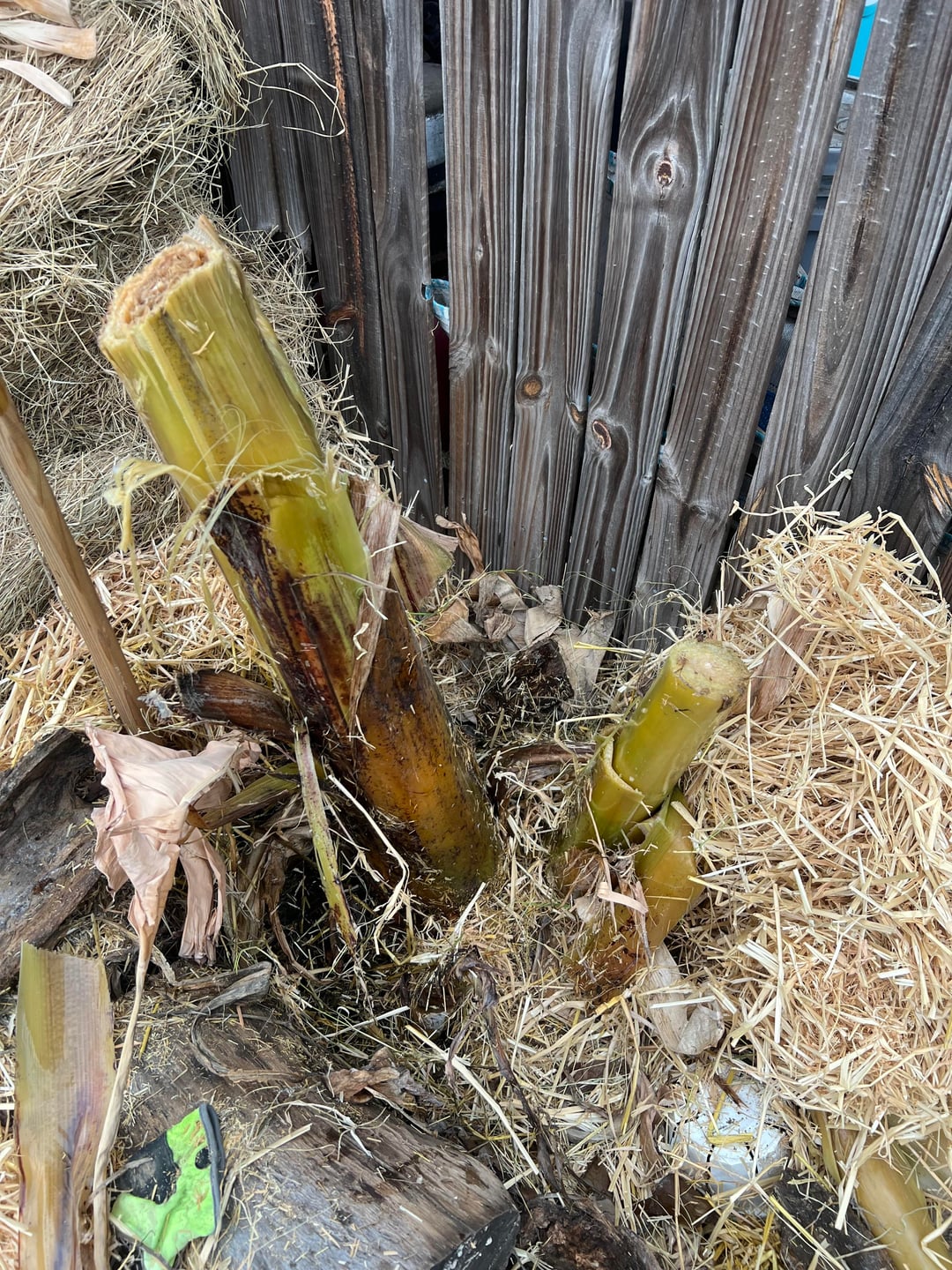 バナナの周りの干し草マルチを引き戻すことにしました。高さ3フィート、幅2フィートのマルチをプラスチックシートで覆った。触るとしっかりしていて、ベビーコーンは上部にダメージがあったものが2個ありますが、根元は硬いです。 2年目の2026年には実を結ぶことを期待しています