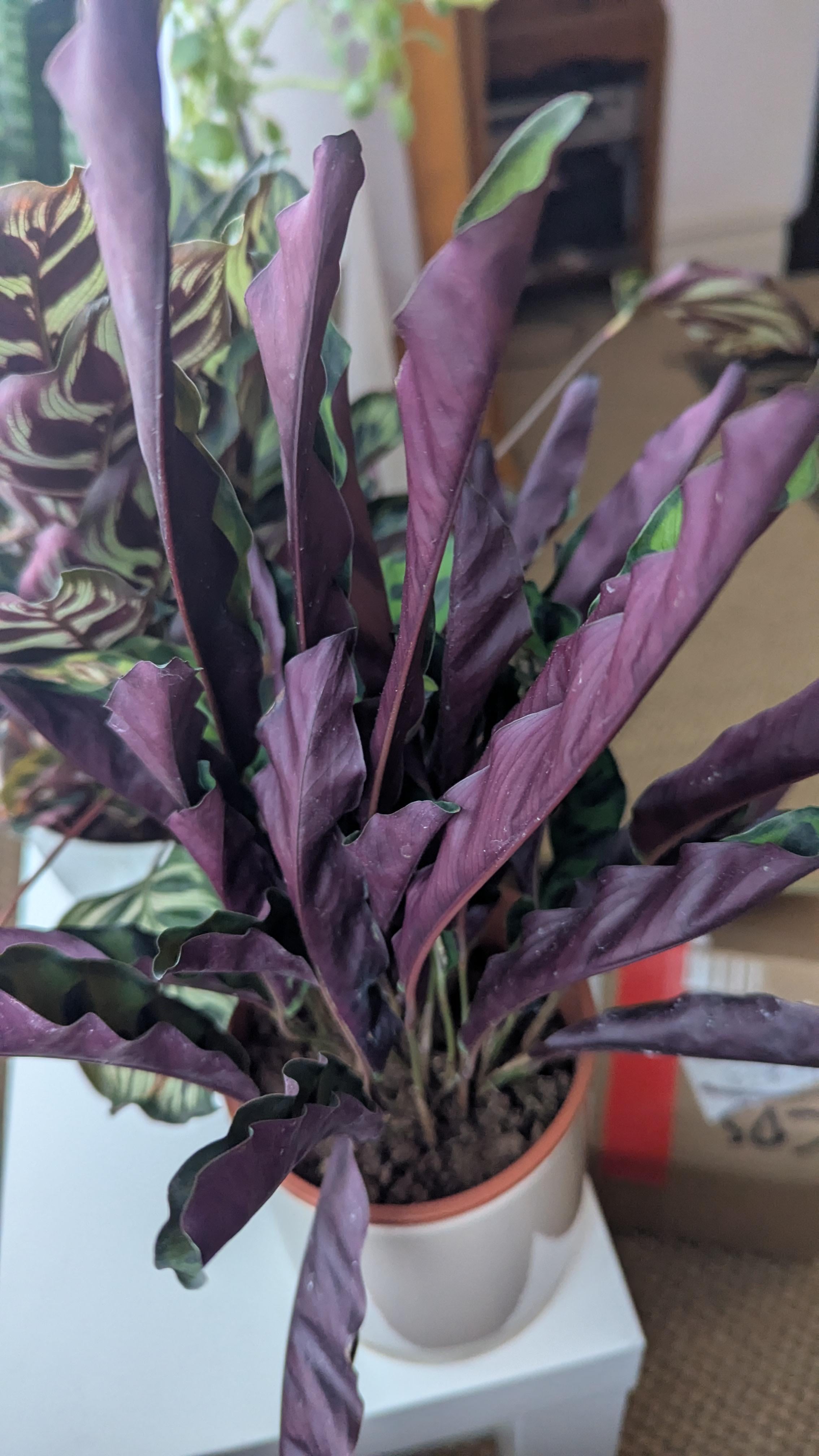うちのカラテアガラガラヘビ、別名ゲッペルティア・インシグニスの葉が半分に折れてしまった理由を誰か教えてください。おそらく休眠中の冬に水をやりすぎたからでしょうか?回復するでしょうか?洞察/アドバイスをよろしくお願いします。