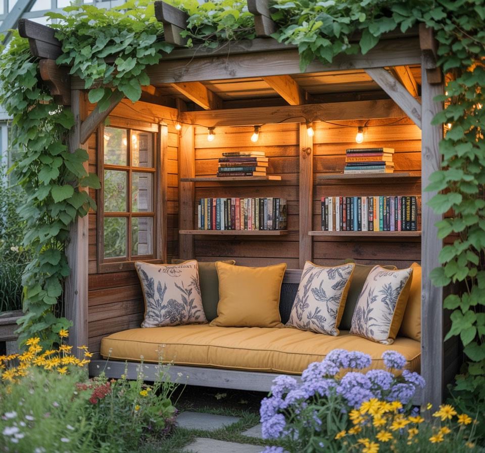 庭でのひとときを充実させる、居心地の良いパーゴラの読書コーナー 15 選