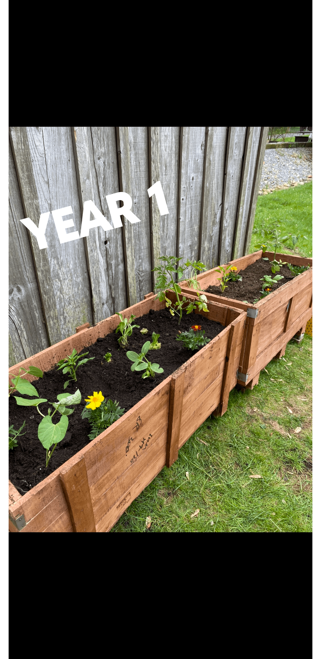 1 年目: 夫が仕事からいくつかの木製の輸送用箱を持ち帰ってきました。設置場所がホースの近くになかったため(考えていませんでした)、水やりを続けるのが苦痛すぎたため、ほとんど成功しませんでした。ベリーの茂みを植えましたが、今は繁栄しています!