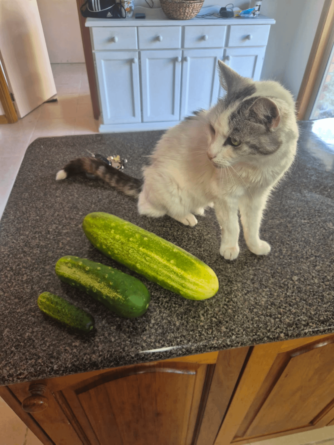 お父さんはキュウリをいくつか育てました…スケール用の猫