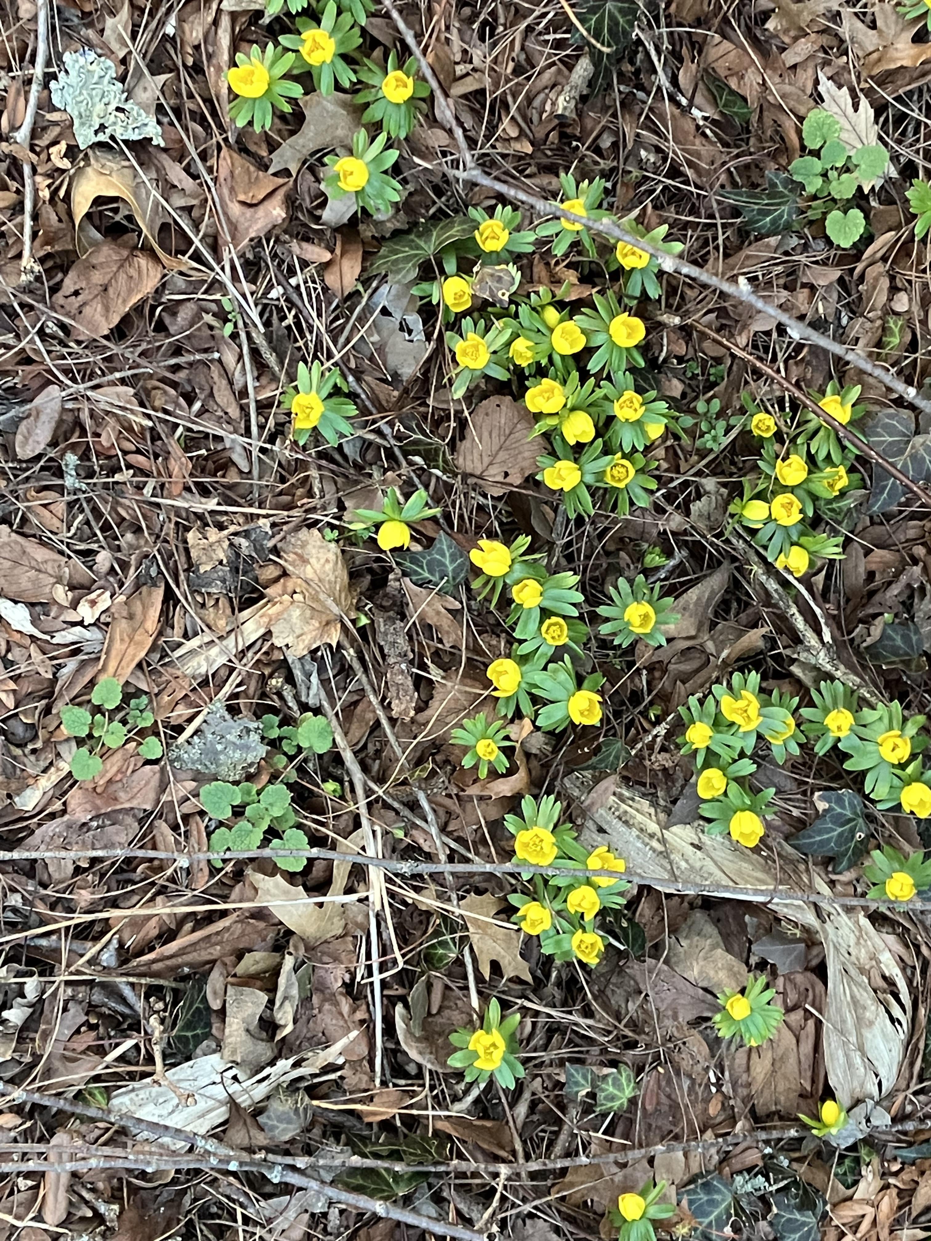 ここオハイオ州北東部では氷点下の天候が 2 週間以上続いた後、華氏 40 度から 50 度の日が数日続いたので、冬のトリカブトが開花することにしました。今日も寒いので花は閉まっています。