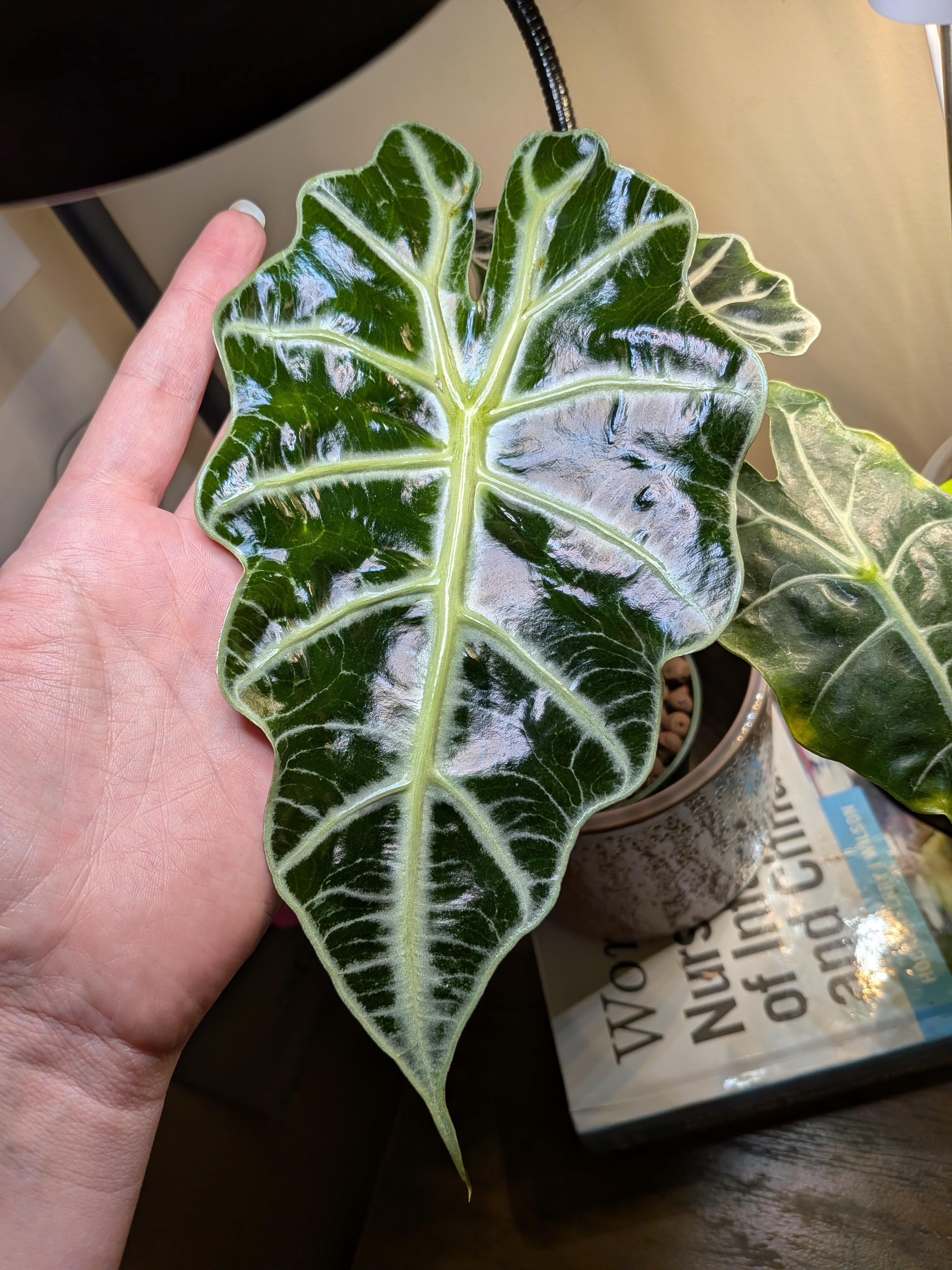 クワズイモの一番新しい葉は私の手と同じくらい大きいです。