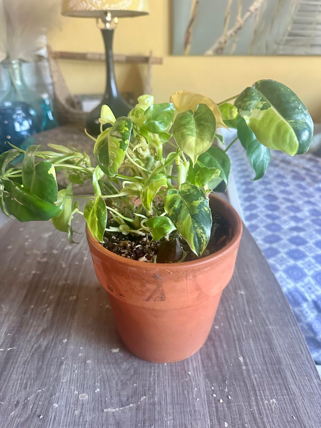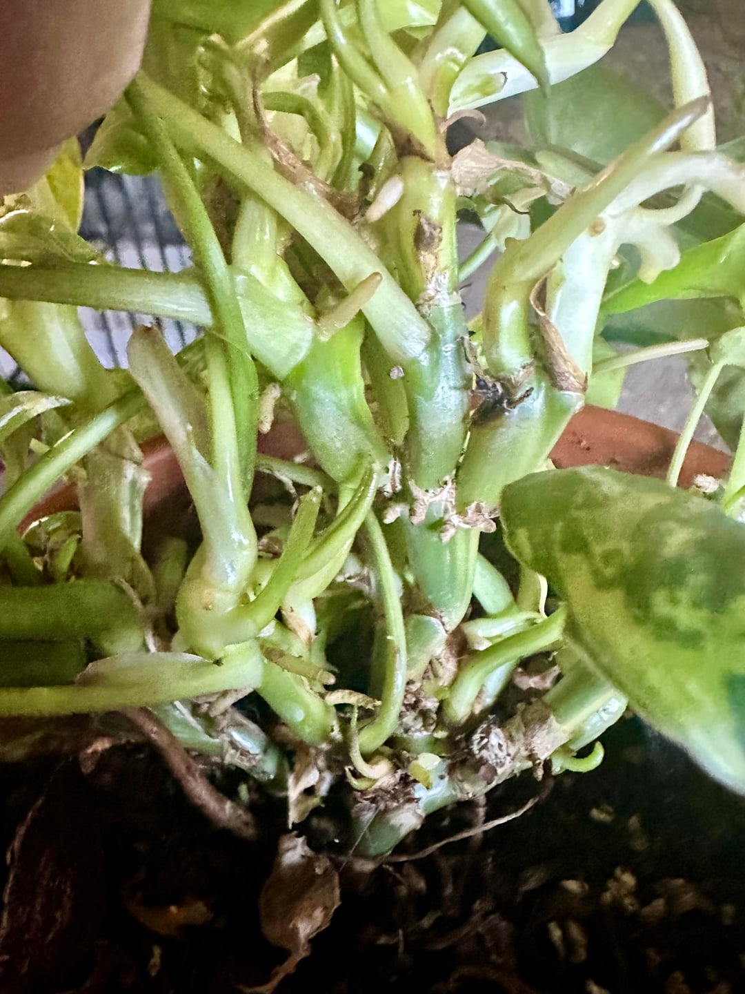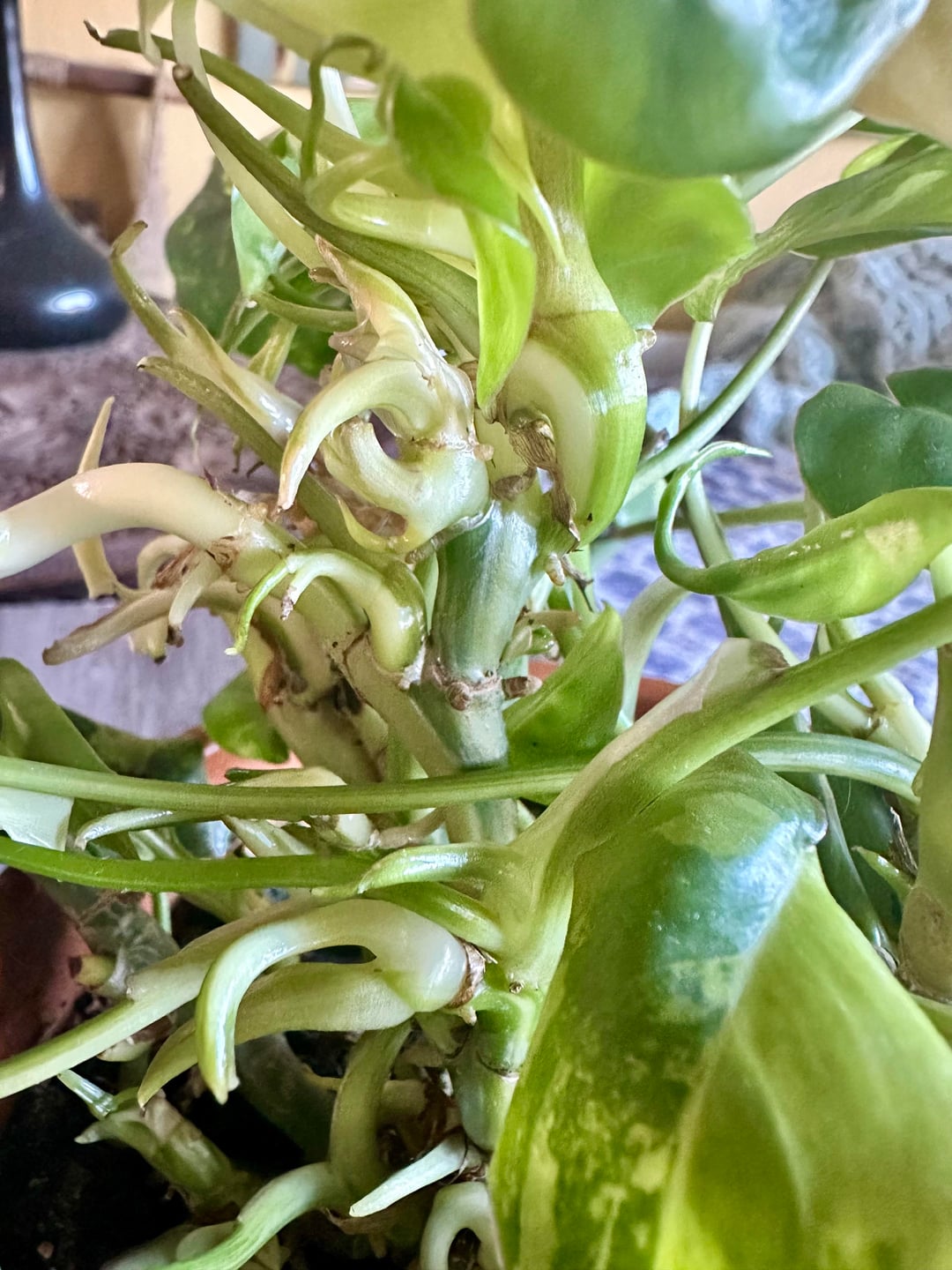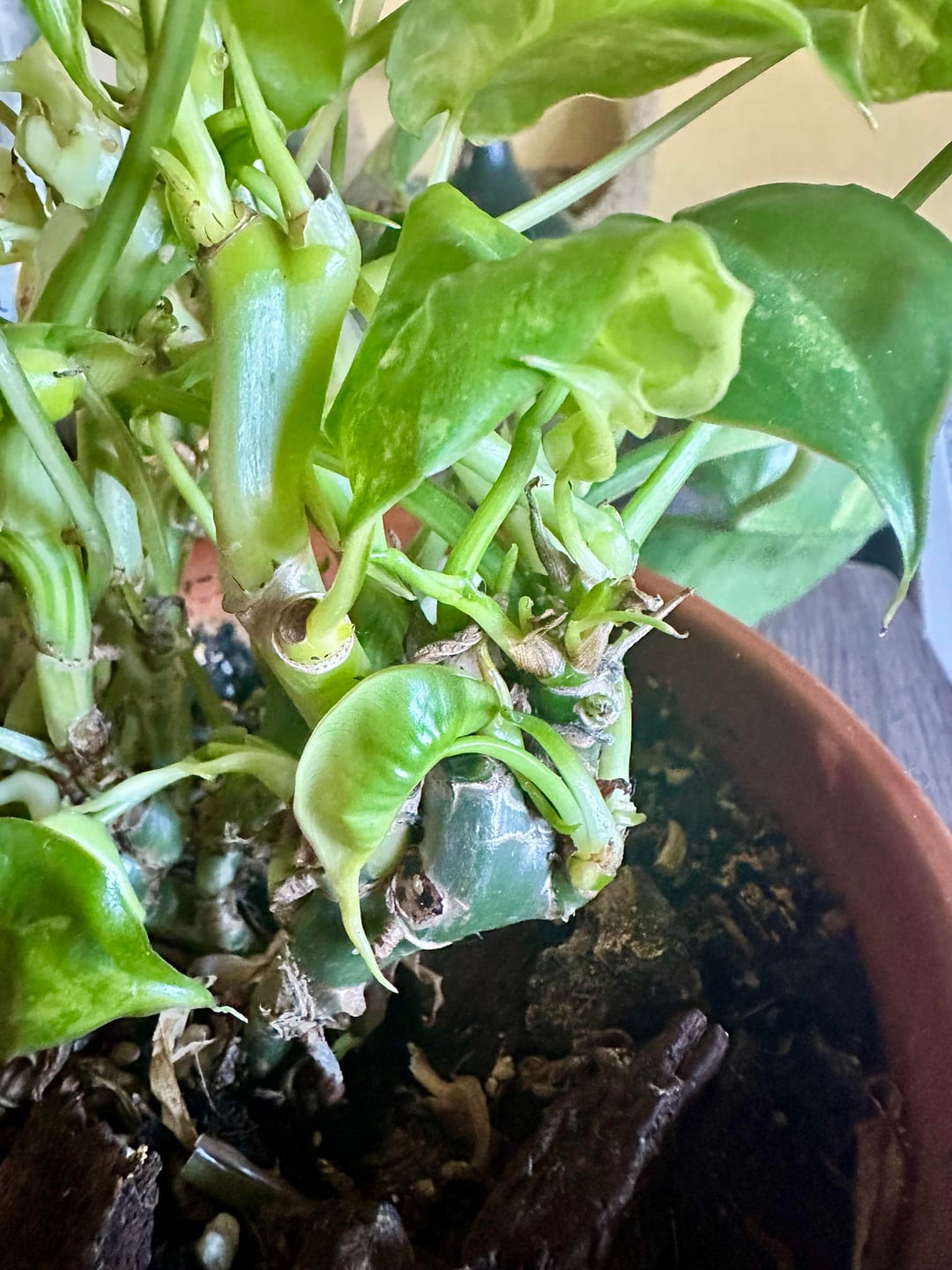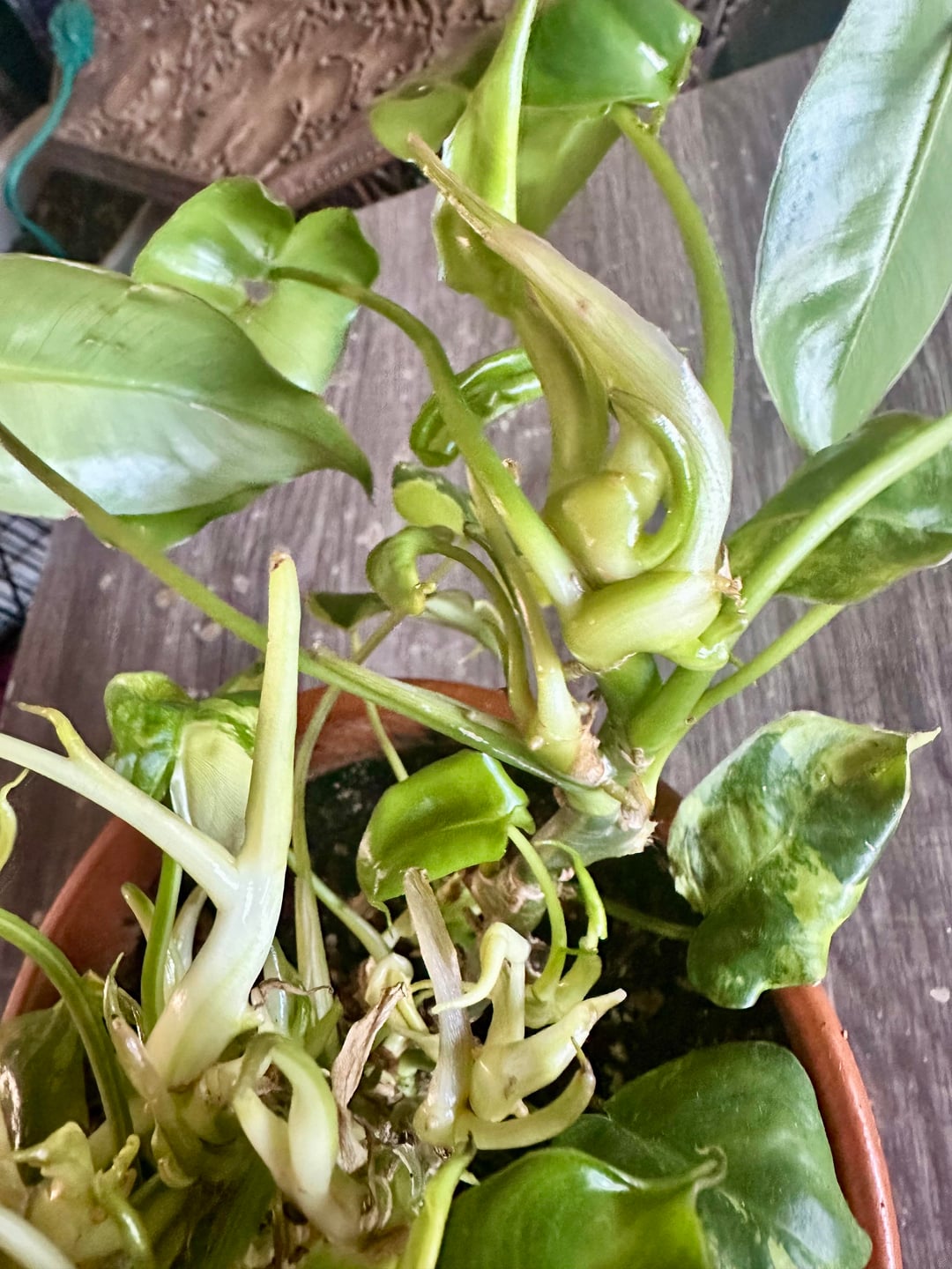 紋付き植物や、変形した植物を生み出す複数の成長点に関する知識を持つ人。これはフィロデンドロンです。成長点は成長を続け、葉はどんどん小さくなっていきます。