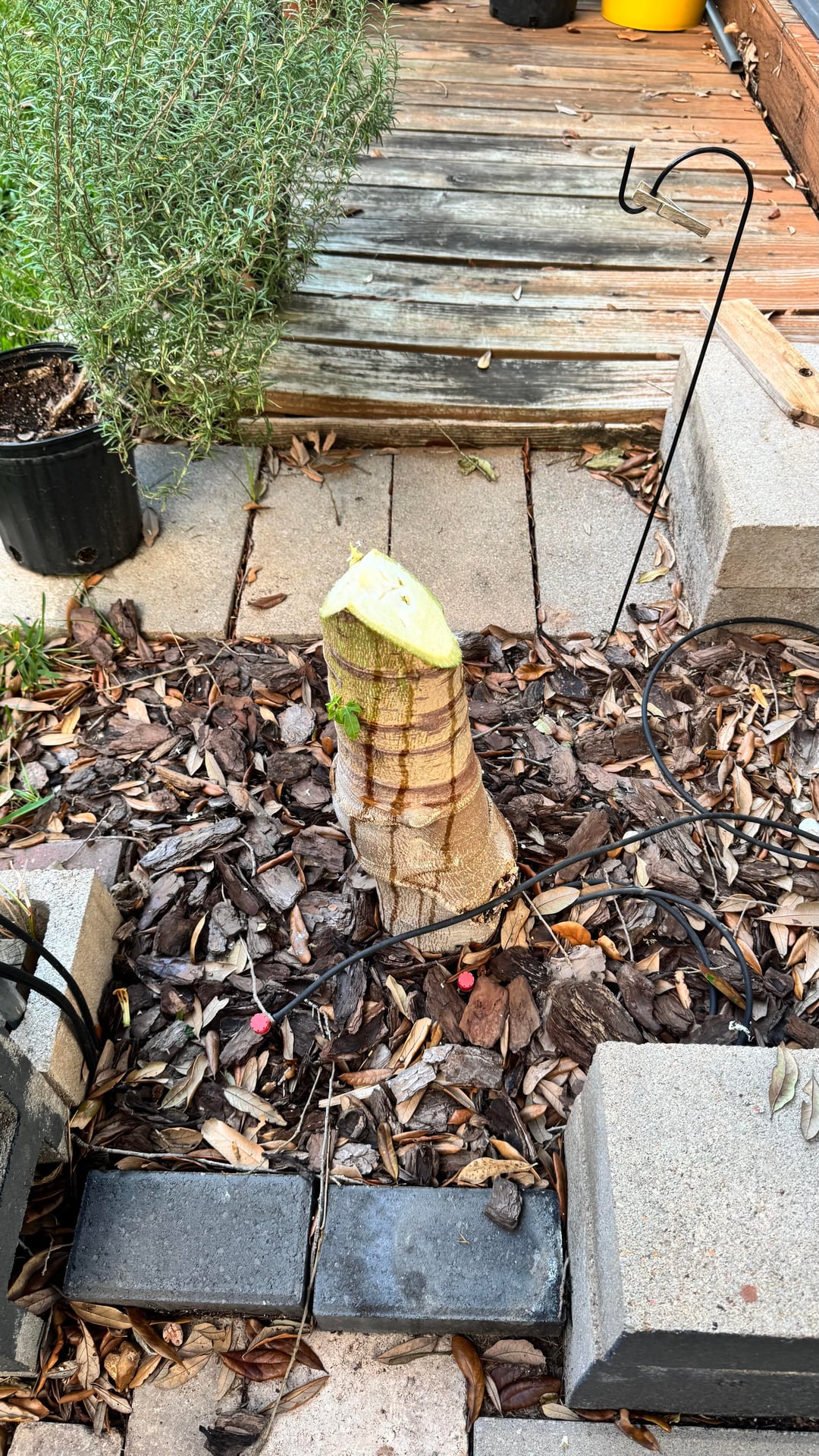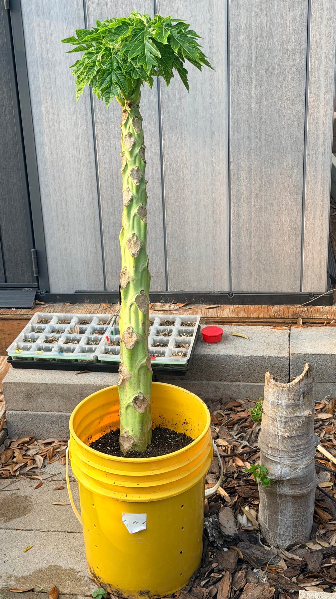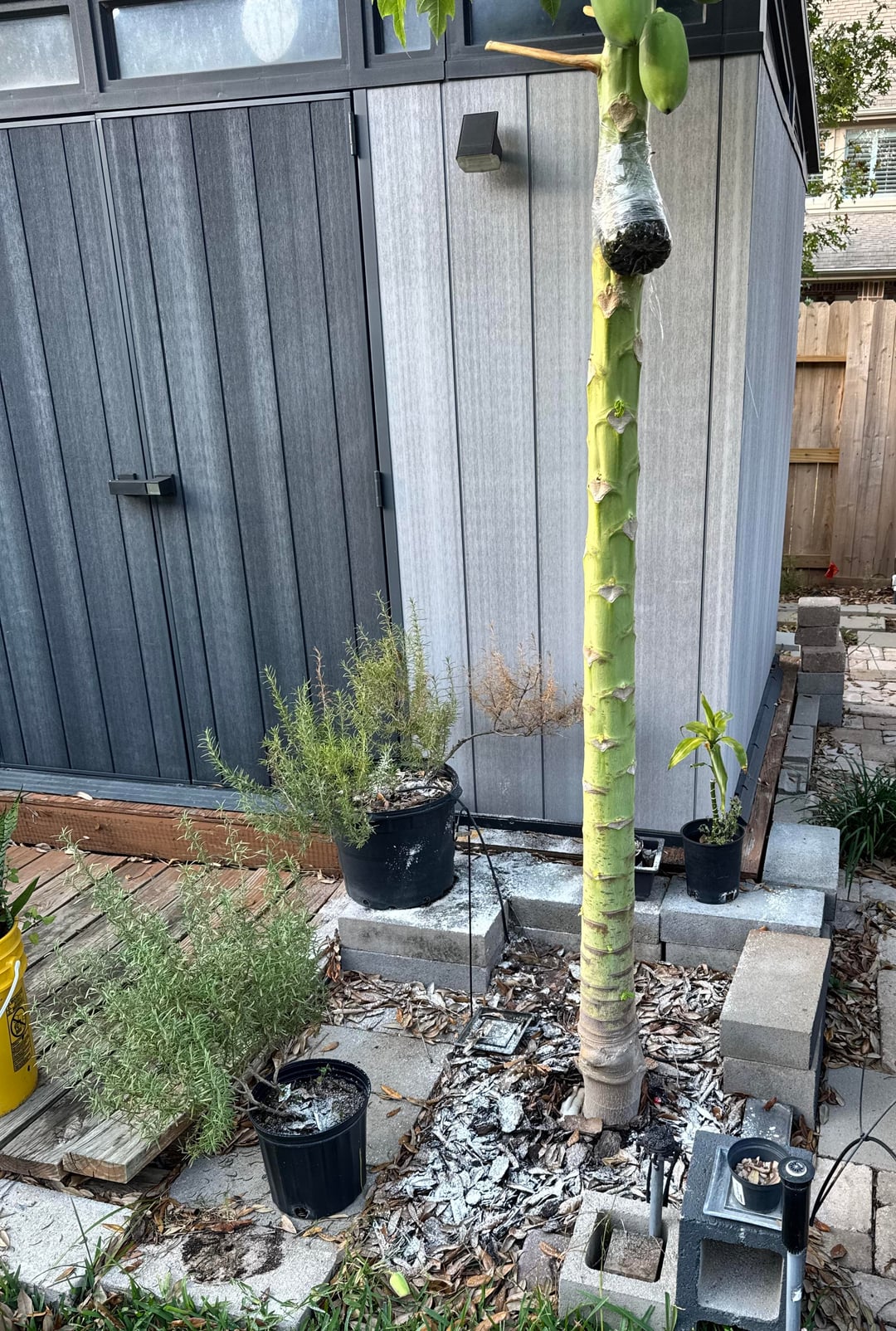 10月3日にパパイヤの空気層を作り始めました。寒冷前線の影響で12月12日に切りましたが、今にして思えば、待っておけばよかったと思いました。 30F未満のストレッチを数回行いました。切り株を気泡緩衝材とバケツ数個で覆いました。根が出たトップをガレージに運びました。切り株は24°Fまでの温度に耐え、新たな成長を示しており、上部はまだ生きています。それが最後のフリーズであることを祈るばかりです。