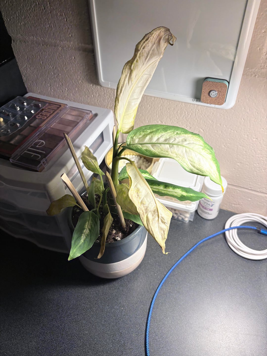 やあ、寮に住んで6ヶ月になりますが、先月まではブヨ以外の植物に問題はありませんでした。ディフェンバキアの葉の先が黄色くなり始め、半分以上黄色になったところで切り取ったのですが、それだけでは終わりませんでした。一度に1枚ずつ葉が枯れ始め、今週末には大量の葉が枯れてしまいました。どうすればいいのかわかりません!週に一度水やりをし、新しい土を与えて根の状態をチェックし、肥料も与えました!今週末、酸素が足りていないのではないかと思い、土の中に箸を入れてみましたが、効果はありませんでした。葉は以前は硬かったのに、ふわふわして紙のように感じられます。