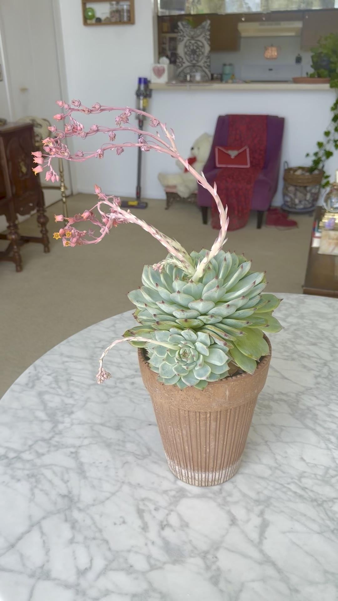 通常、これらの花は数か月ごとに切り取っていますが、今回は共有する必要がありました。エケベリアの赤ちゃんはママのようになりたかったのか、自分で花も育てました🌺 これはかわいいと思いました☺️ 私はこの多肉植物を9年間飼っていて、たくさんの赤ちゃんを生み出しています。