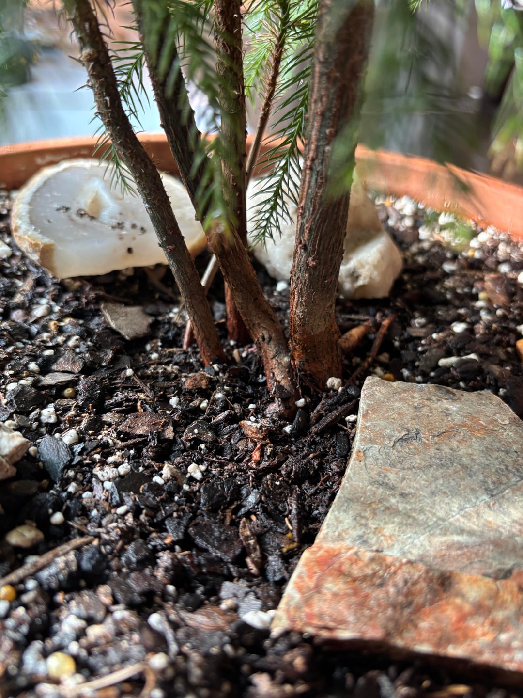 本を読んでいると、苗床では植物をより豊かに見せるために多くの木を一緒に植えており、これらの幹は最終的には分離する必要があることがわかりました(私の場合は5つの異なる幹があります)。