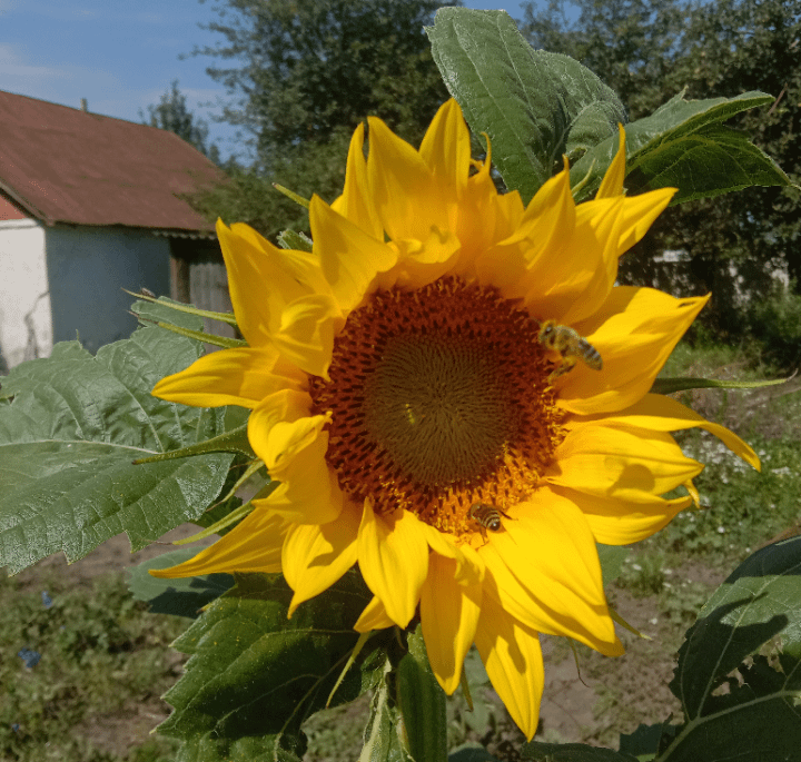 私は庭のひまわりが大好きです、そしてミツバチも大好きです)