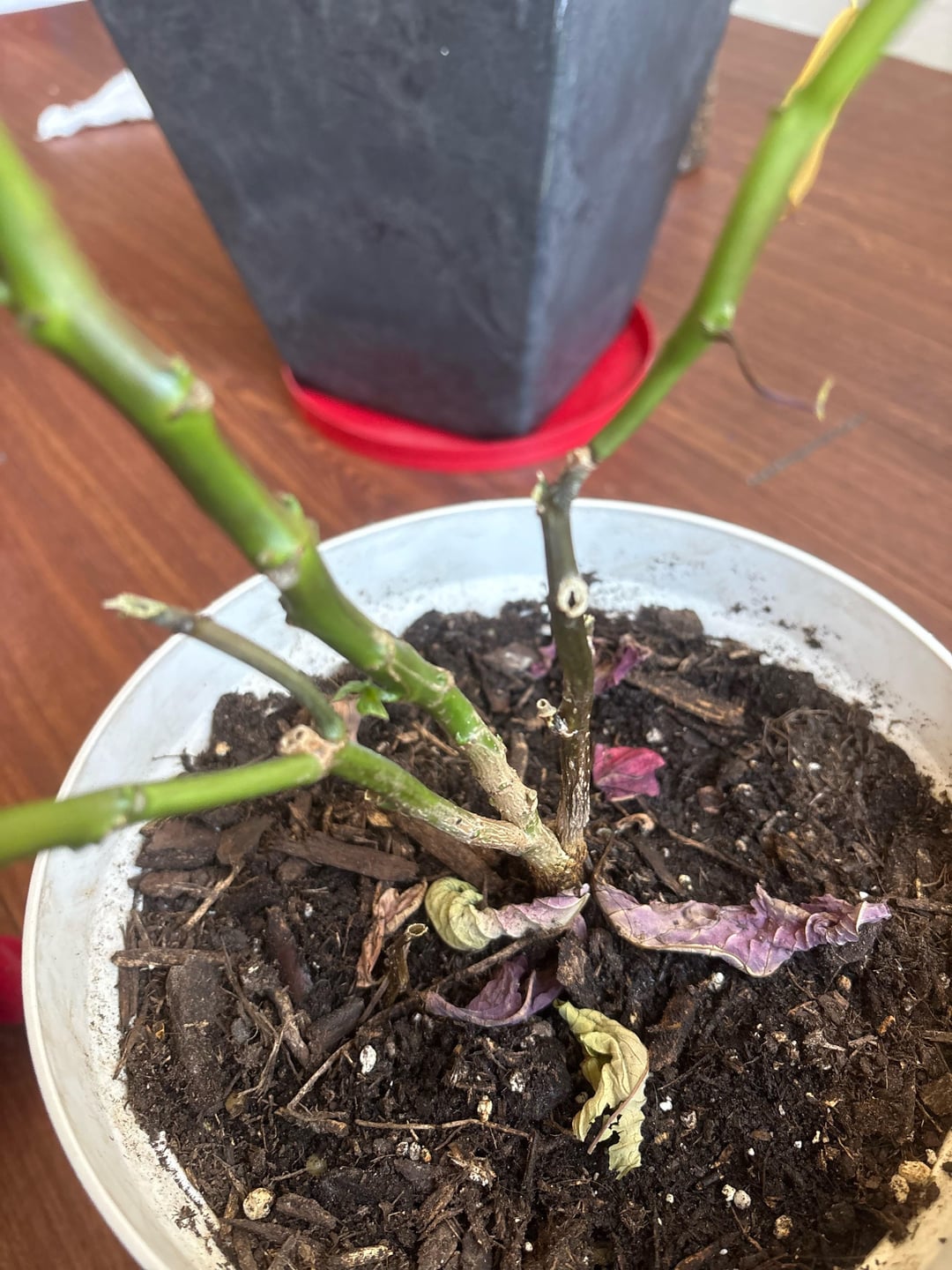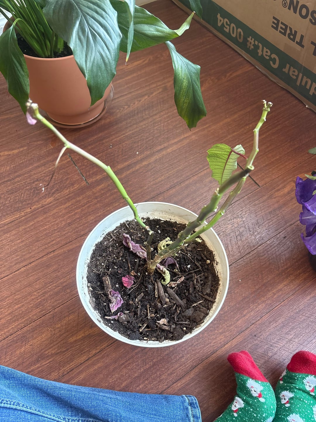 11月下旬に帰ってきたポインセチアのはずなんですが、もらった時とは全然違うんです。茎はふにゃふにゃで空洞になっている部分もありますが、葉は1枚しかありませんが、中央の茎に小さな葉が2枚生えています。それは底の樹皮だと思いますが、幹の部分が紫色になっている公園もあります。しかし、それ以外はすべて落ちてしまいました。根が伸びてきたので3週間ほど前に植え替えましたが、直射日光が当たらず、週に一度濾過水で水やりをしています。彼女を剪定する必要があるのでしょうか、それともこれは正常なのでしょうか、それとも避けられないことを遅らせているだけなのでしょうか?