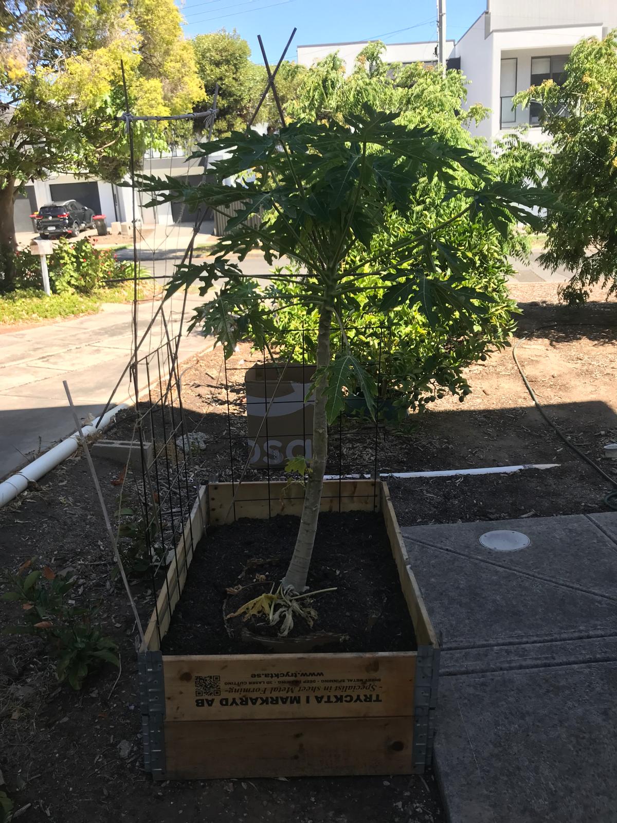 木を邪魔しないように、木の周りに底なしの隆起した庭のベッドを配置しました。さらに鉢植えミックスと堆肥を箱に詰めました。指を交差させたままにする。