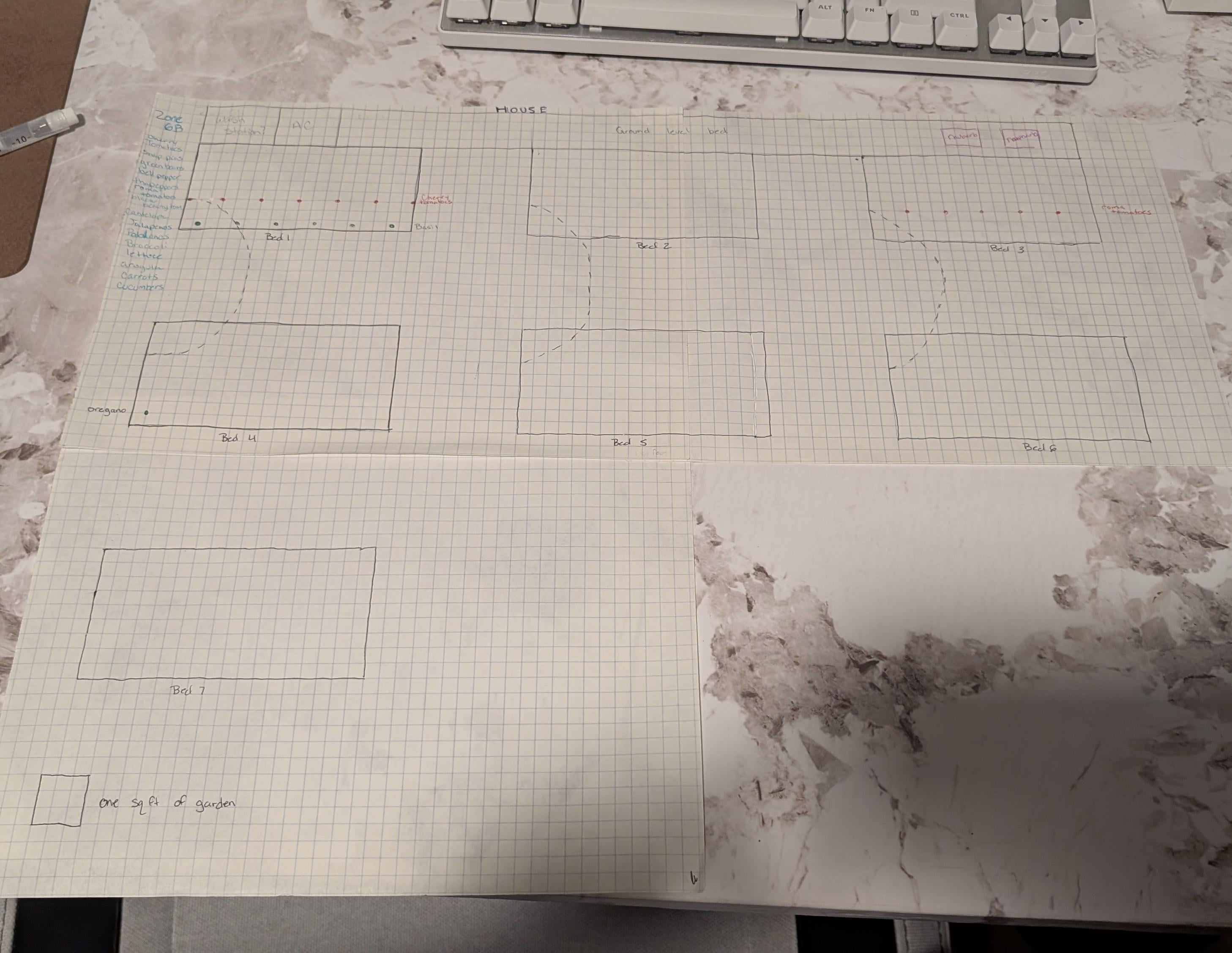 ガーデニングの計画を立てている女の子や母親を手伝いたい人はいませんか。私はゾーン6bにいます。それらは高さ12インチ、長さ6フィート、幅3フィートのレイズドベッドです。ベッドの配置の画像を添付しました。ページの上が北側と我が家(平屋)です。屋根のラインには 4 フィートのオーバーハングがあり、その下には家の全長にわたる地面レベルの庭のベッドがあります。北東の角にはすでに2本のルバーブが根付き、よく育っています。今のところ、ここで他のものを育てることに成功したことはありません。現在、上部の一致する 6 つのベッドには、ベッドの 6 フィート側の全長にわたってそれらの間を接続する牛のアーチがあります。