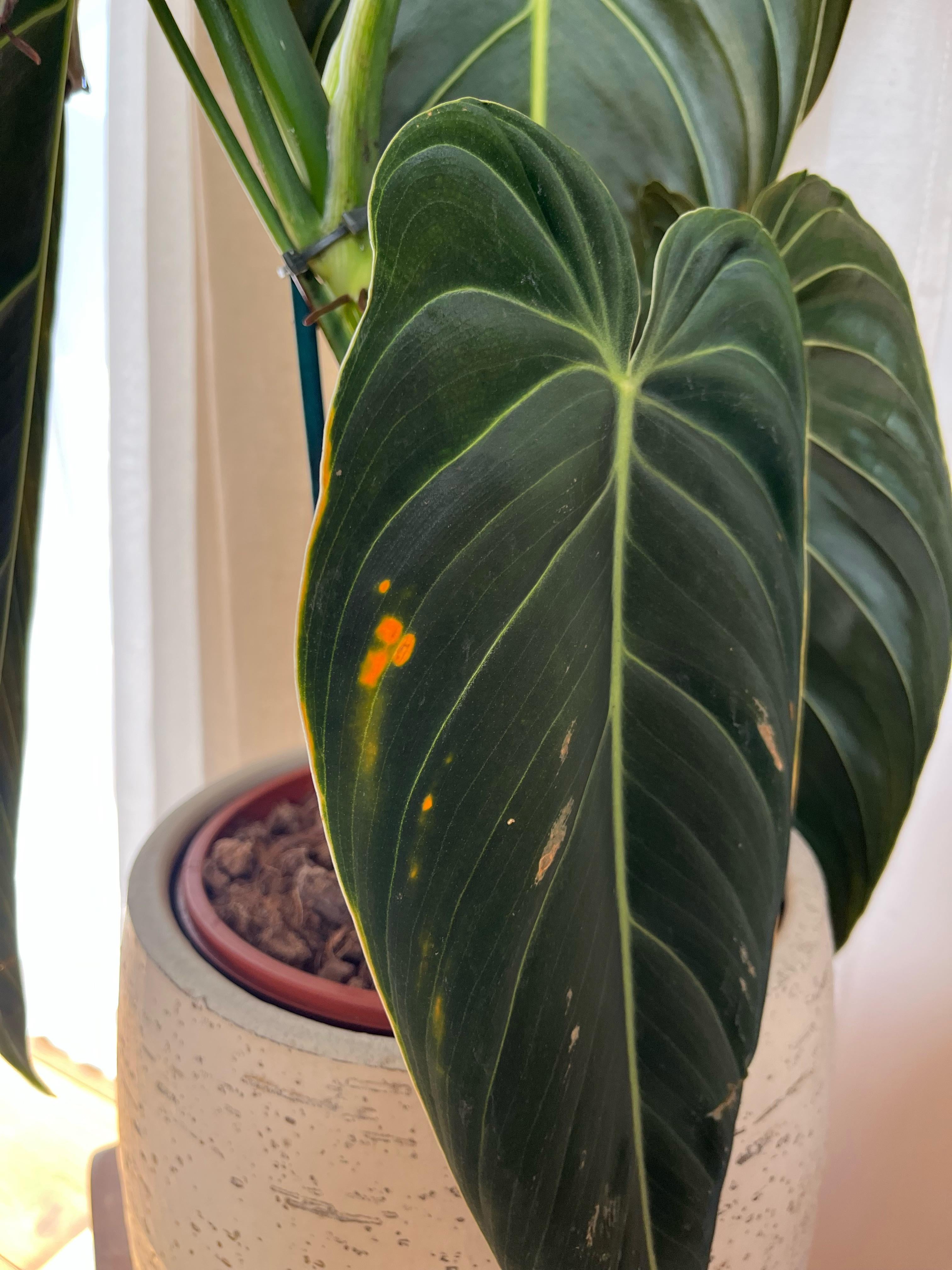 私の新しいベロア フィロンデンドロンにあるオレンジ色の点々が何なのか知っている人はいますか?