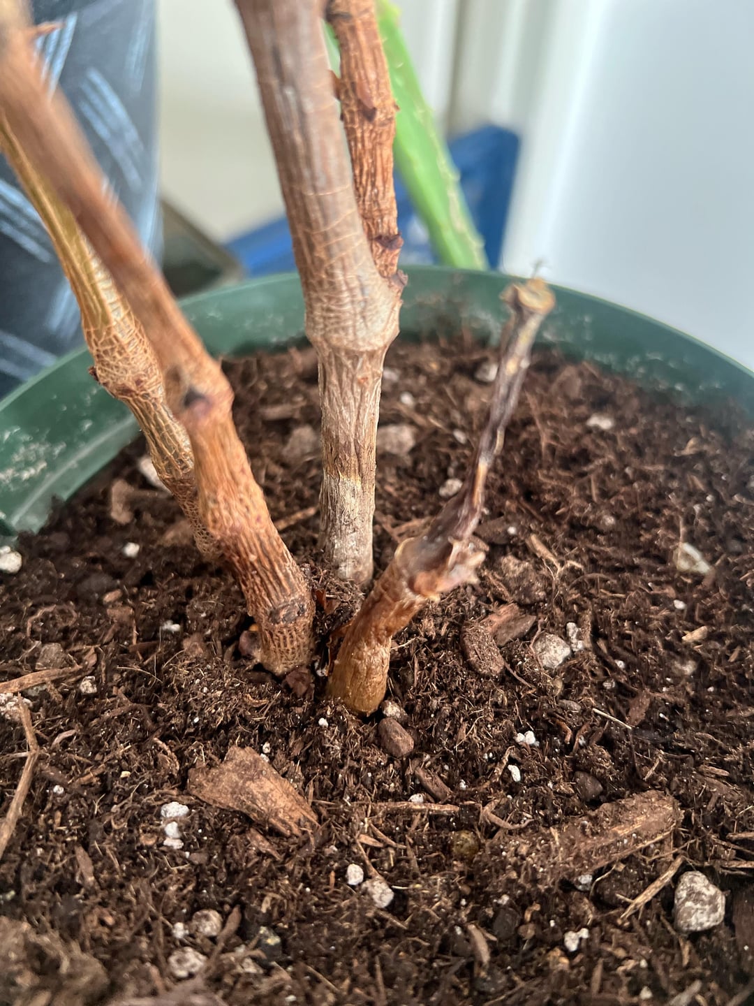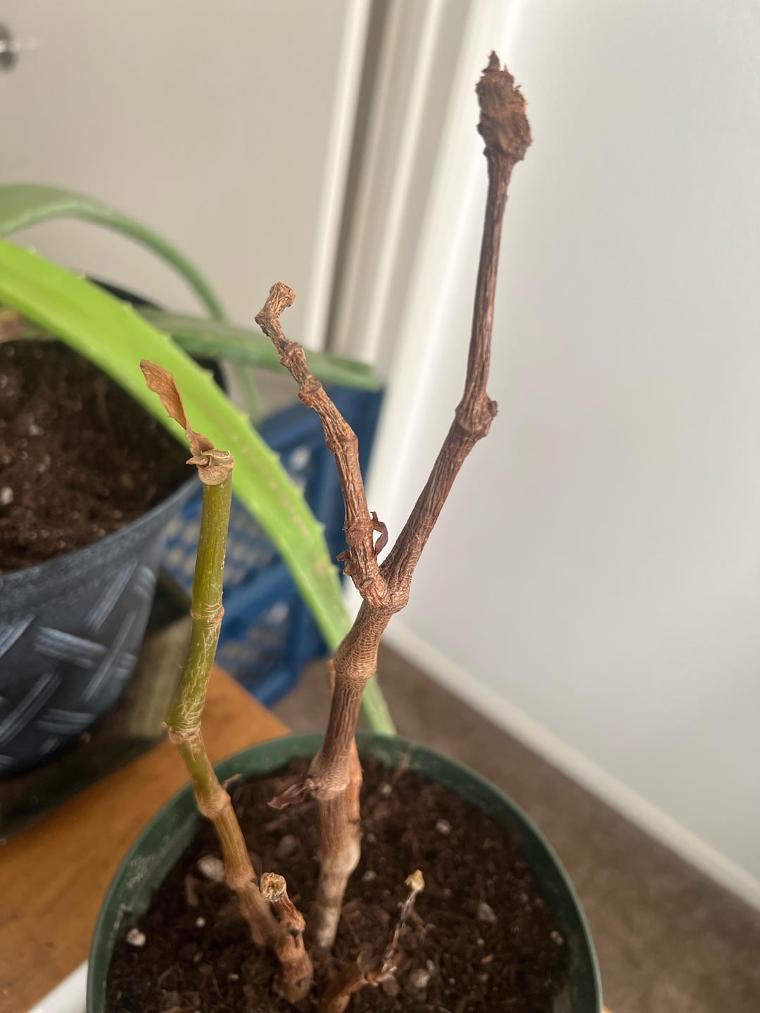 冬の間、ベゴニアを室内に入れたのですが、葉を落とし始め、突然枝がしなび始め、根元には白い部分がありますが、根は健康そうに見え、匂いもありません。助けてください。):