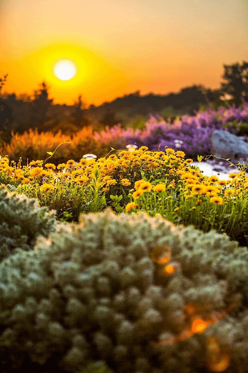 家族の別荘で、朝日の光の下で早朝の庭の風景