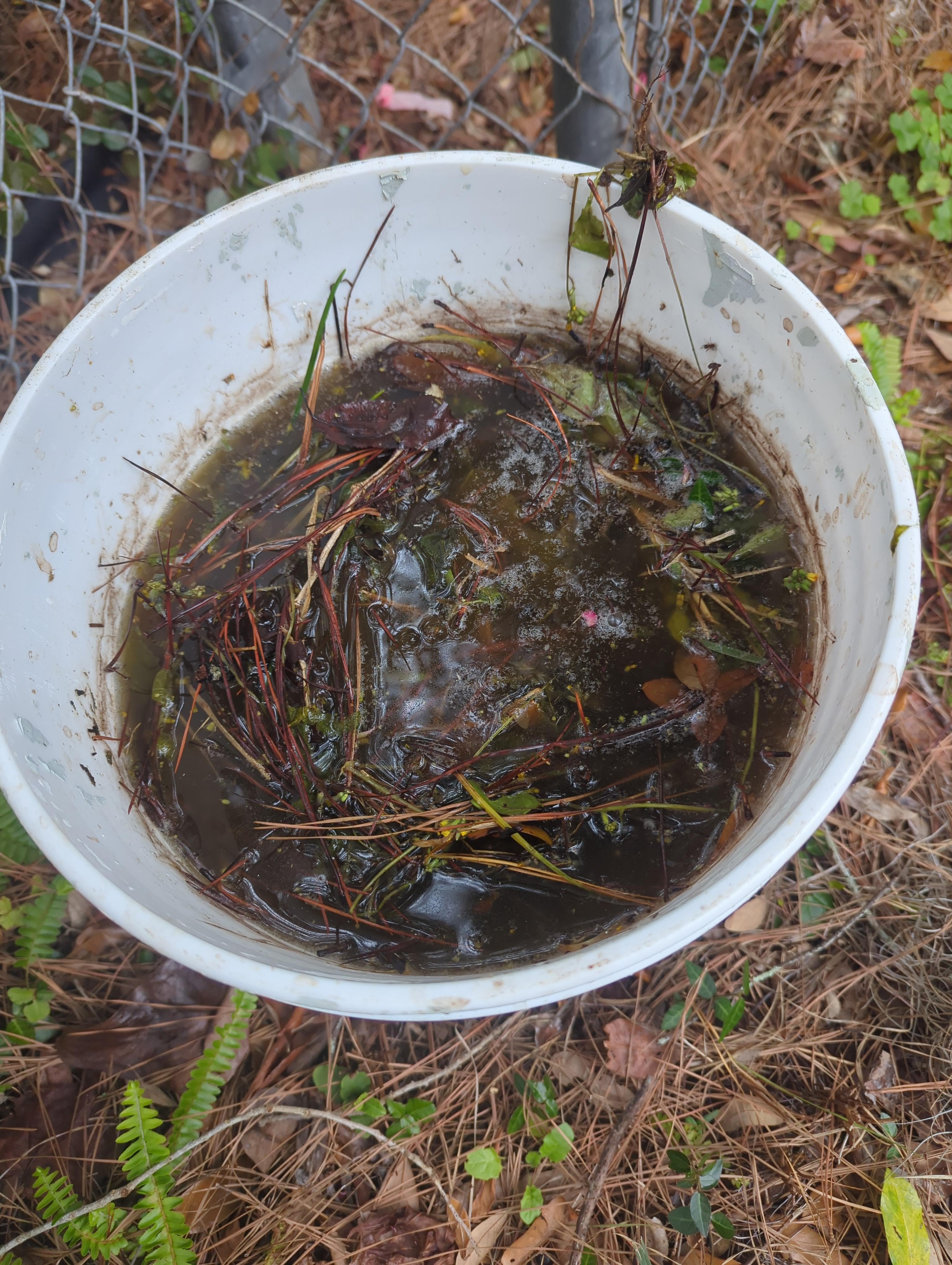 約 2 か月前、ハウスメイトと私が草むしりをしていたときに、水を堆肥化することについて話しました。 "取り除く" 雑草を取り除いて肥料を作ります。私たちは何も調べずに、蓋なしで数インチ浸すのに十分な水を入れた巨大な塗料バケツに雑草を放り込み、すぐに忘れました。先週、それを思い出してシャベルで数回かき混ぜました。あまり雨が降っていなかったにもかかわらず、そこはまだ水に浸かっており、植物はまだわずかに緑色をしていて(良い兆候ではないかもしれません)、肥料のような匂いがしています(良いかもしれませんが、悪いかもしれません?)。松葉もたくさん採れました。
