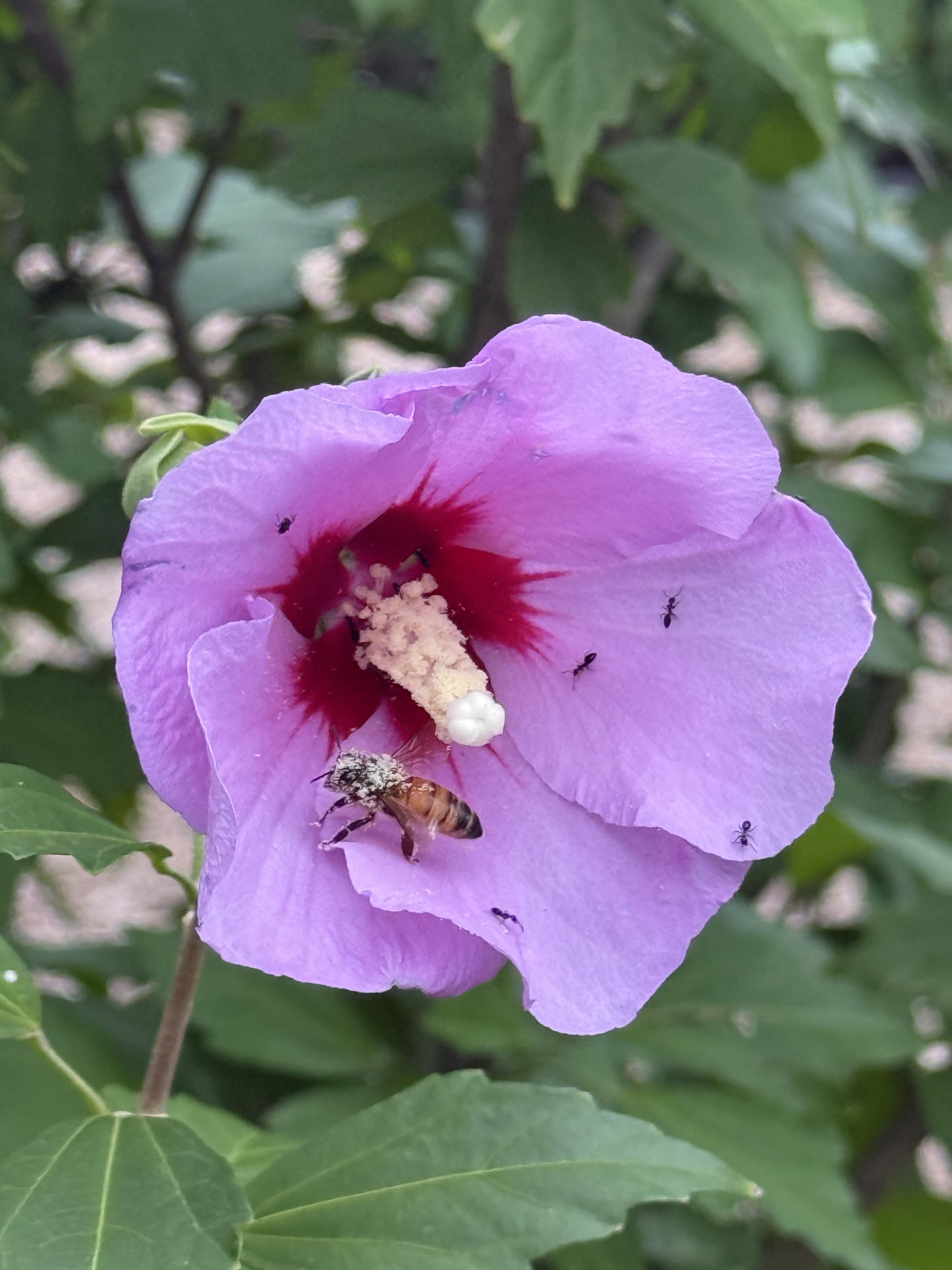 花粉にまみれてムクゲの作業をしているミツバチを捕まえました。背景のアリもその混乱を楽しんでいるようです。