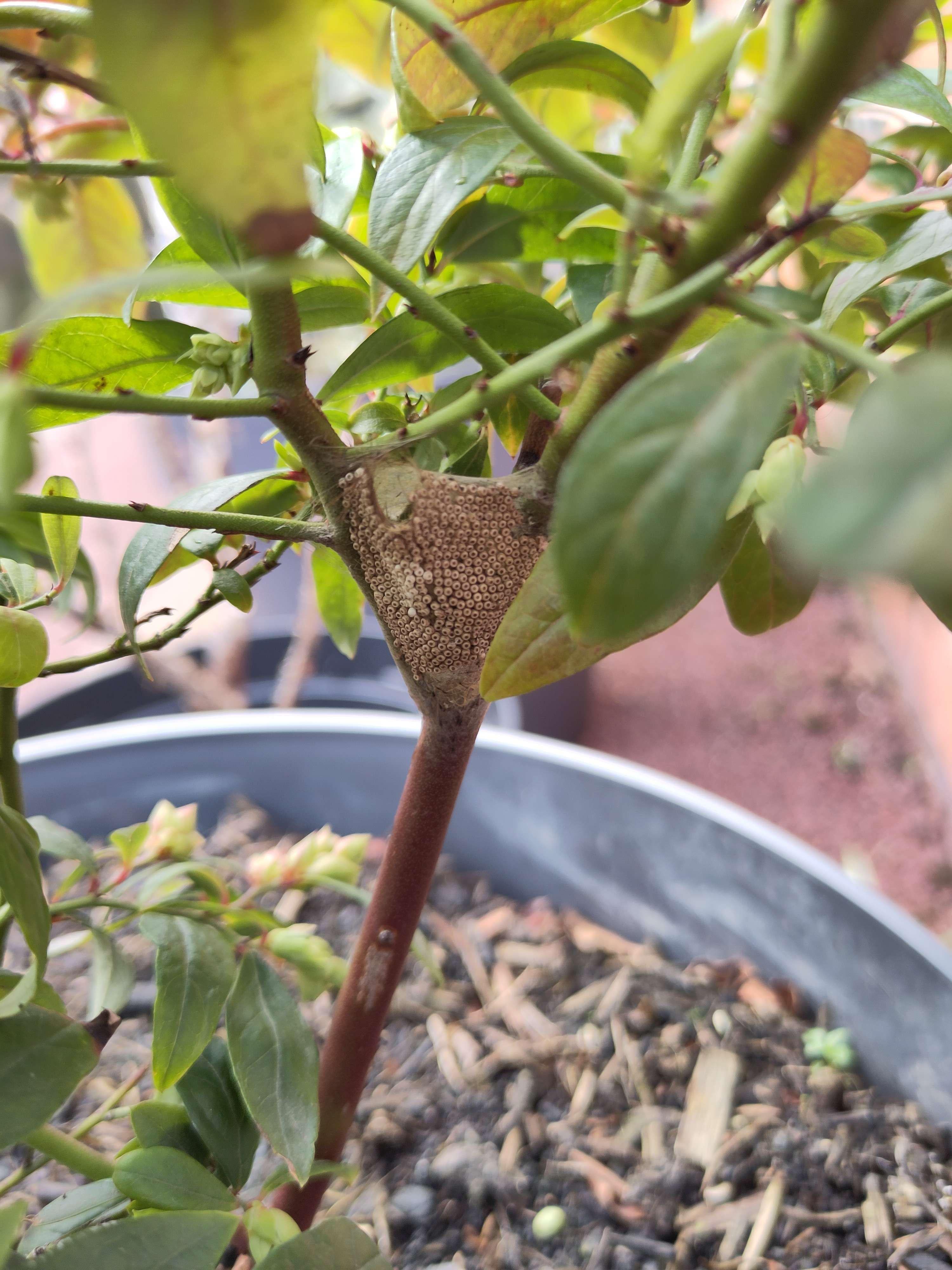 これらは何ですか?英国の屋外の鉢植えのブルーベリーの茂みで見つかりました。