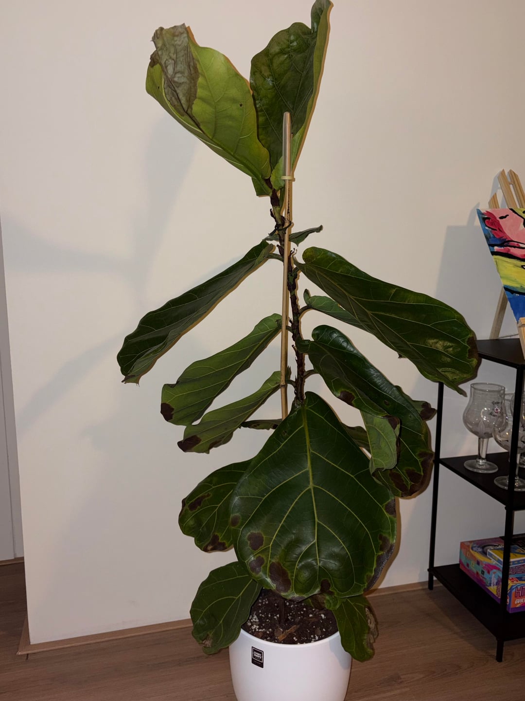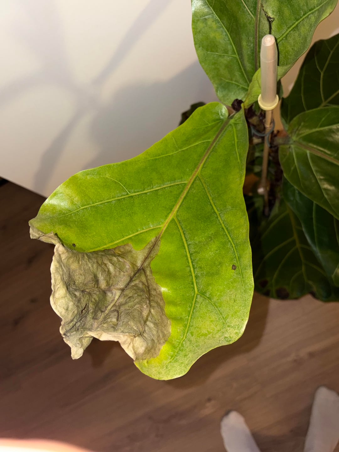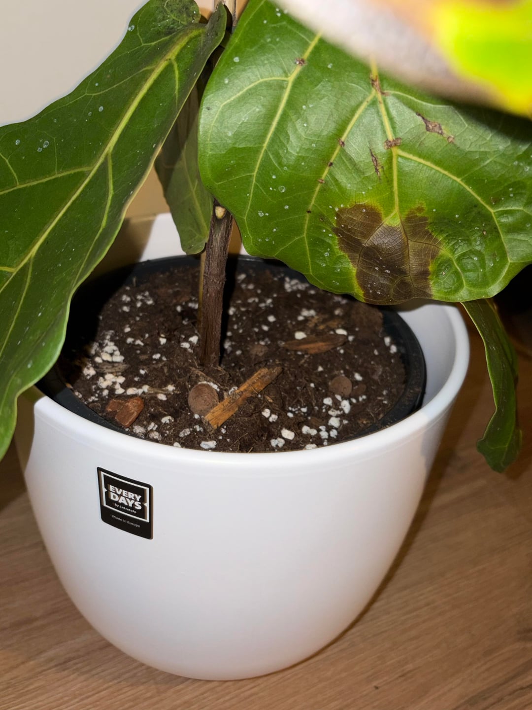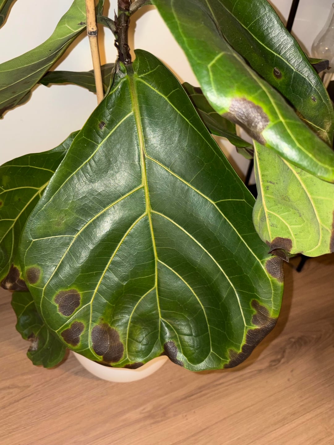 フィカス・リラタを3か月間飼っていますが、調子が良くありません。考えられる原因について Reddit の投稿をたくさん調べました。私が主に遭遇したのは根腐れ/水のやりすぎでした。入っていた鉢には水抜き穴があり、水はけもしっかりしています。底の土が濡れすぎていないか棒で確認しましたが、そうではありませんでした。では、葉にあるこの乾燥した斑点や黒い斑点はどこから来たのでしょうか?