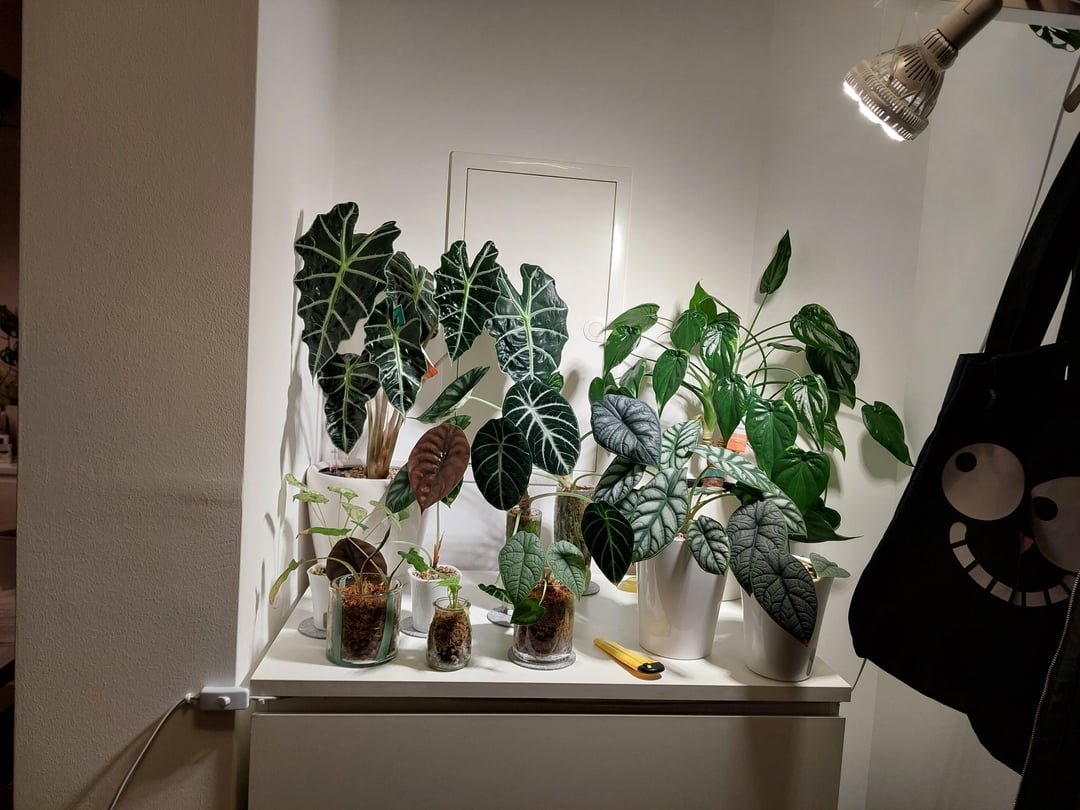 Before / After のセンスがこれに適していることを願っています。 とにかく、私のクワズイモ(+1 ファイロベイビー)は約 2 年間、暗い場所で暮らしていますが、問題はなく、すべて簡単なので、彼らはご褒美に値すると思いました。 (両方とも同じ A. ポーリーの葉でライトリーダー アプリを使用して測定)