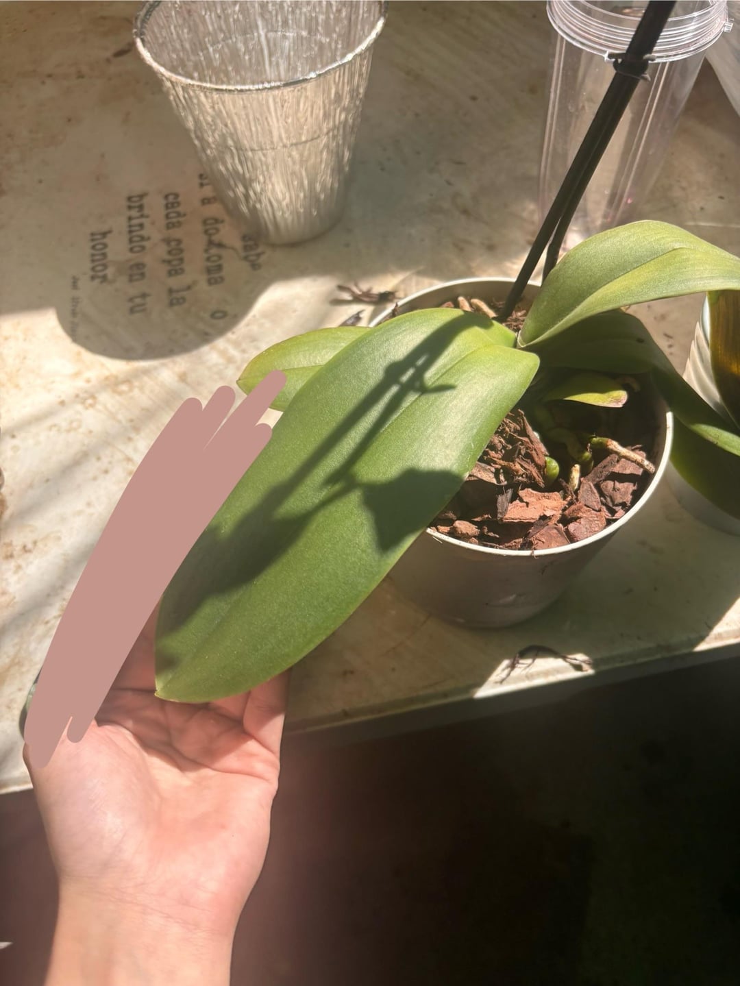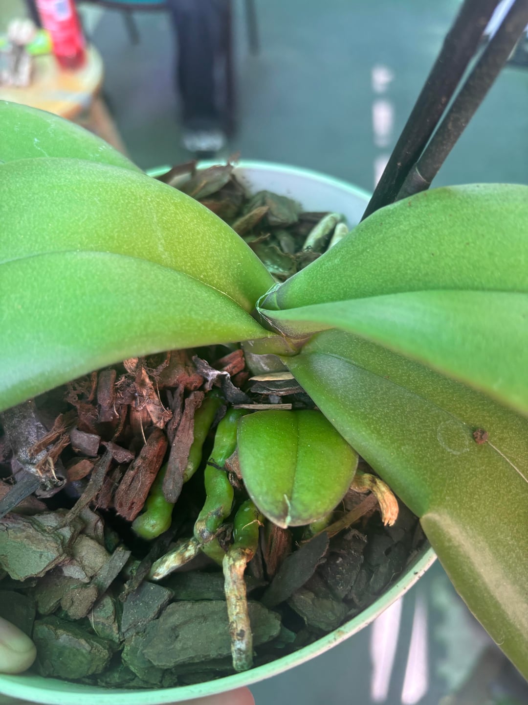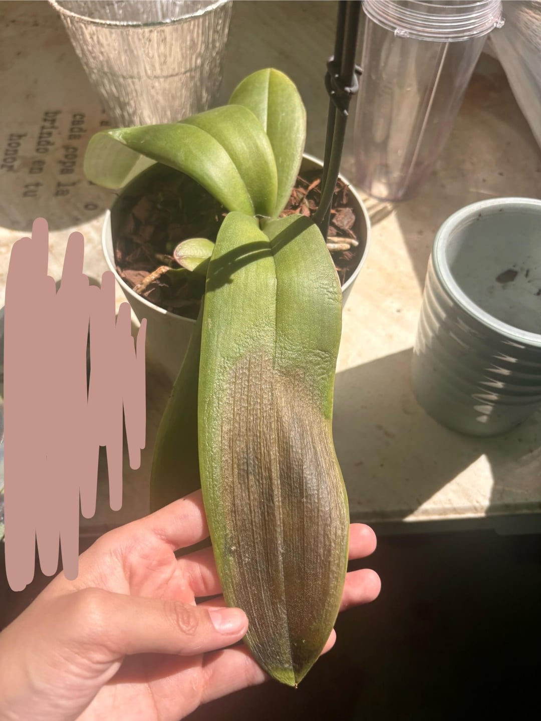 私はこの蘭をホームセンターで購入しましたが、約2年間で彼女は成長していました。でもその後、彼女を外に放っておいたら、思ったより暑くなってしまった(双極性障害、ああ、テキサスの天気)。彼女は茶色くなり始め、ゆっくりと垂れ始めました。最近彼女を植え替えて、それが私がミラクルグロウを使用した問題だったかどうかを確認しました "蘭用鉢植えミックス" しかし何も変わりませんでした。助けてください