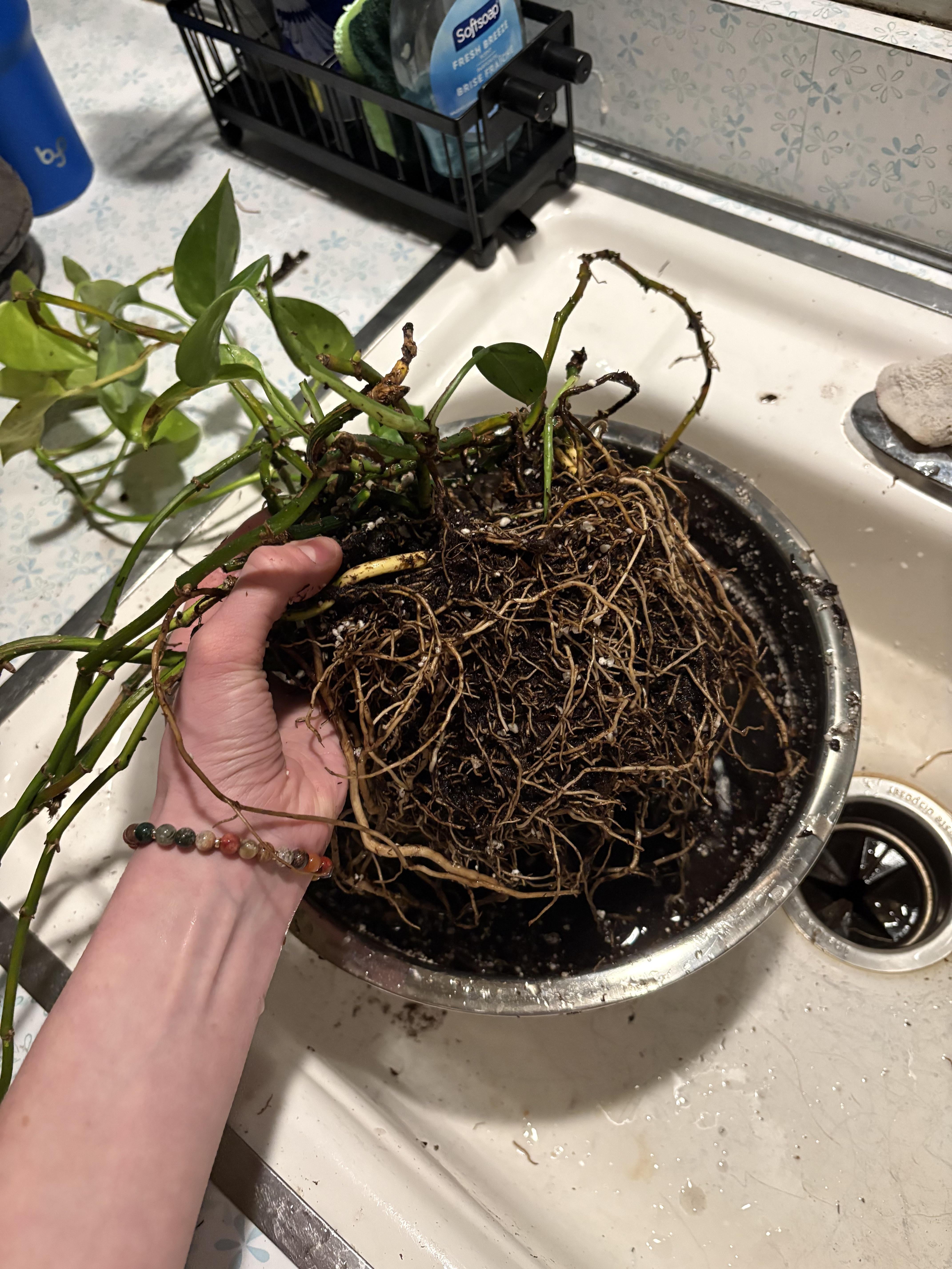 私はこのポトスの植物を持っており、数年前に4つの植物を一緒に植えました。現在、根はすべて一緒に包まれており、技術的にはまだ生きていますが、成長していません。保存方法がわかりません。どうすればよいですか?根はすべて混合されていますが、紙のような物質が各植物の根元の周りにあるように見えます