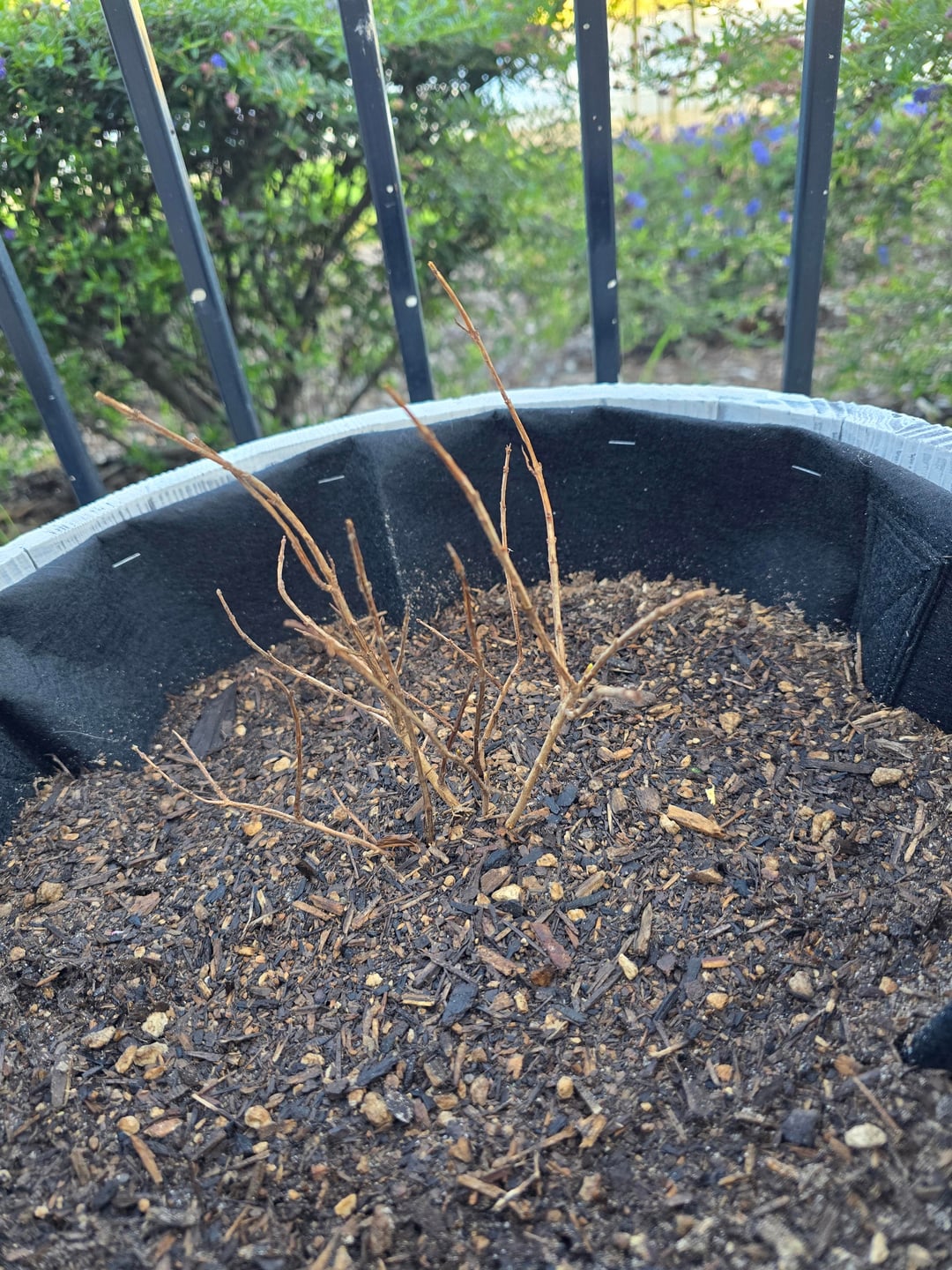 こんにちは!不思議に思って植えてみましたが、正しく植えられたかどうかはわかりません。それは袋の中に茎が入った小さな根の束のようなものでした。それを掘り出して再起動する必要があるかどうか疑問に思っています。助けていただければ幸いです。 ひどい写真でごめんなさい、そして植える前に植物全体がどのように見えたかの写真がなかったことをお詫びします🤦♀️私は混乱しています。