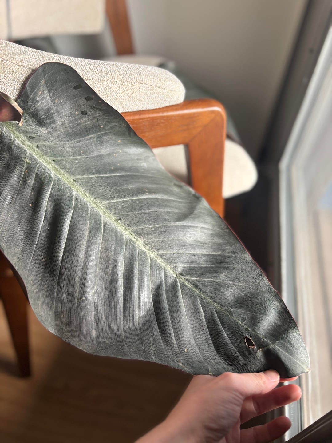 ヘルプ! 。 。 。暗い色の植物の場合: 下の 2 枚の葉が根元から外れ始めています。これを自然にやらせるか、それとも他の葉をよりよくサポートできるように葉を取り除きますか?