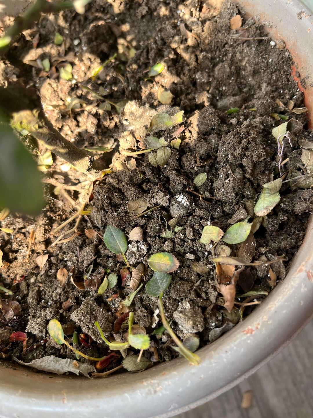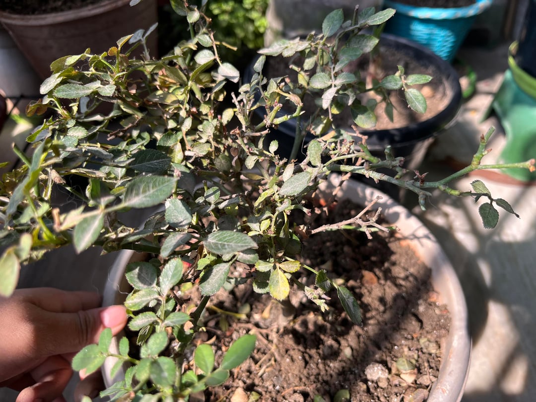 先月このバラを買ってきて、何度も花を咲かせましたが、今は花が止まり、葉を落とし始めています。2日前に水をやったので土が濡れています。