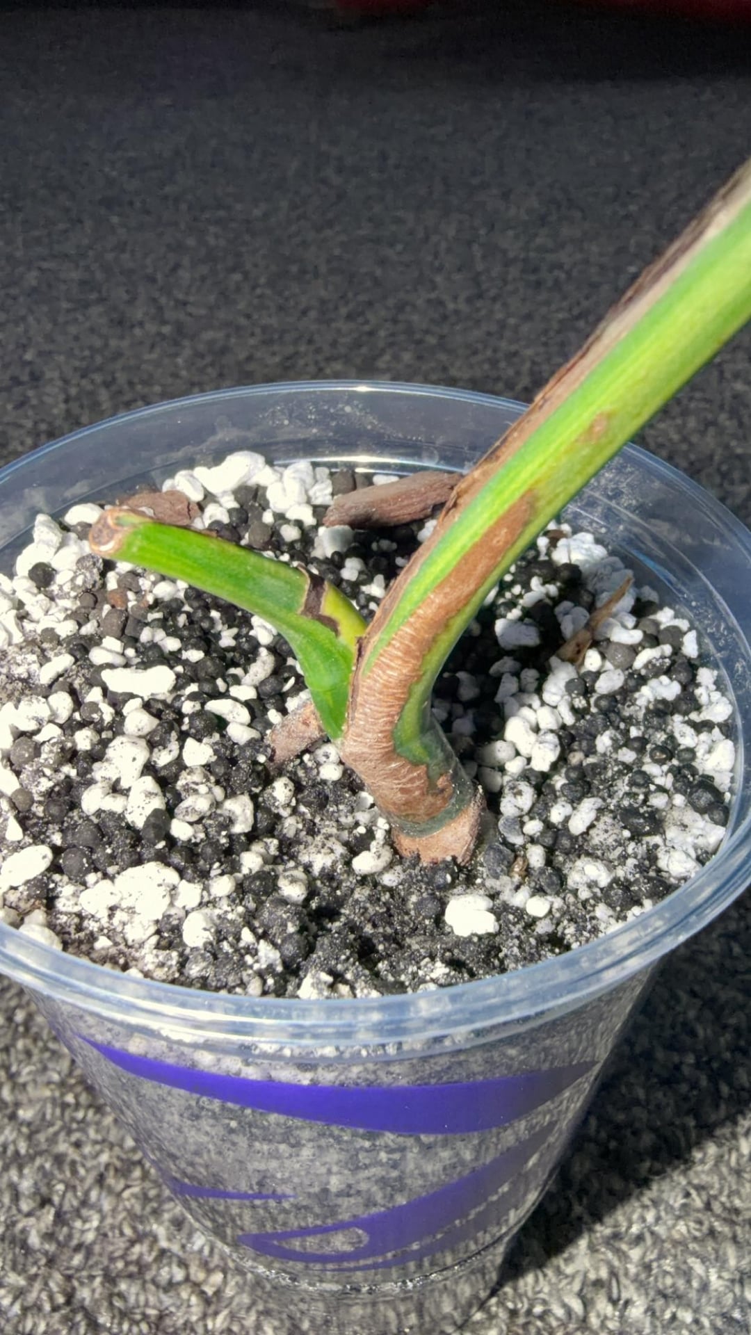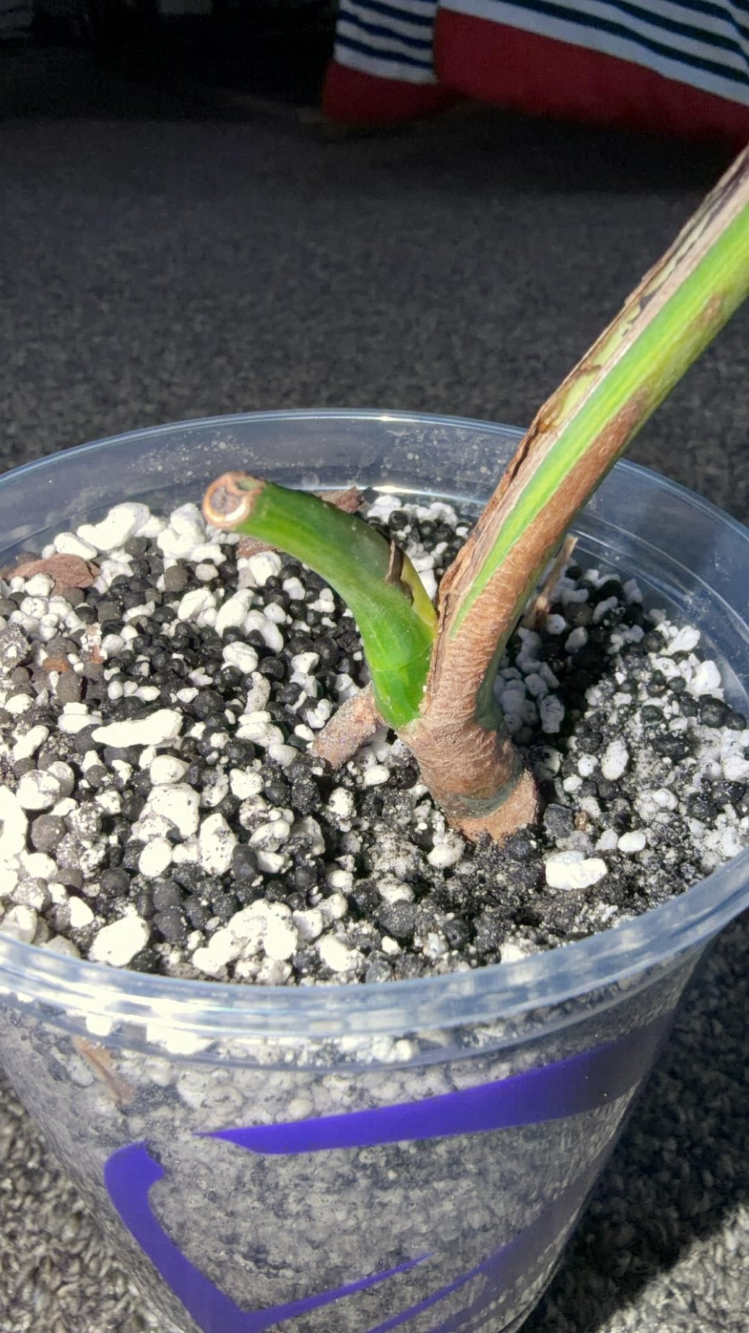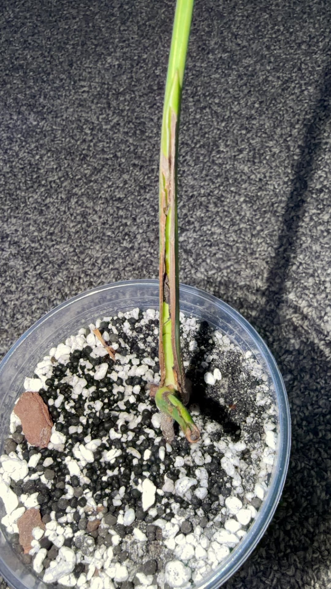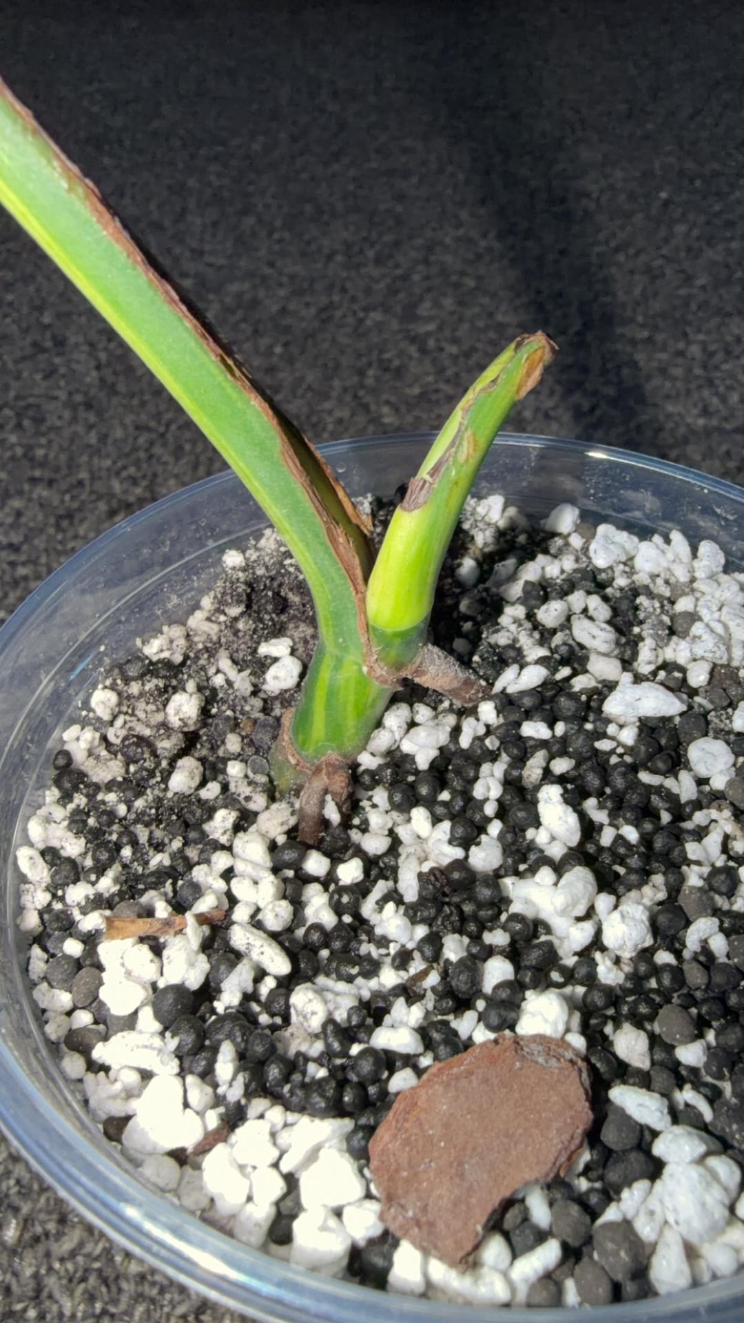 このモンステラ オーレアの挿し木は、おそらく 6 ~ 7 か月前に入手しました。水の中に根を張った女性から購入しましたが、新しい根の成長が見られなかったので、パーライトとフルヴァルの層に投げました。それ以来、たくさんの新しい根が生えてきました。彼女はそのために成長しますが、茎から新たな成長の兆候は見られません。 それはトップカットだったと思います!中の葉が腐ってしまい、完全に発育が阻害されてしまったようです。