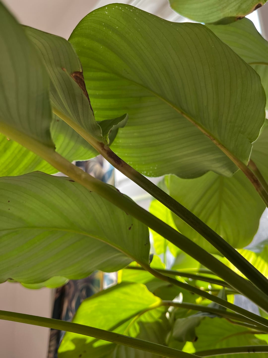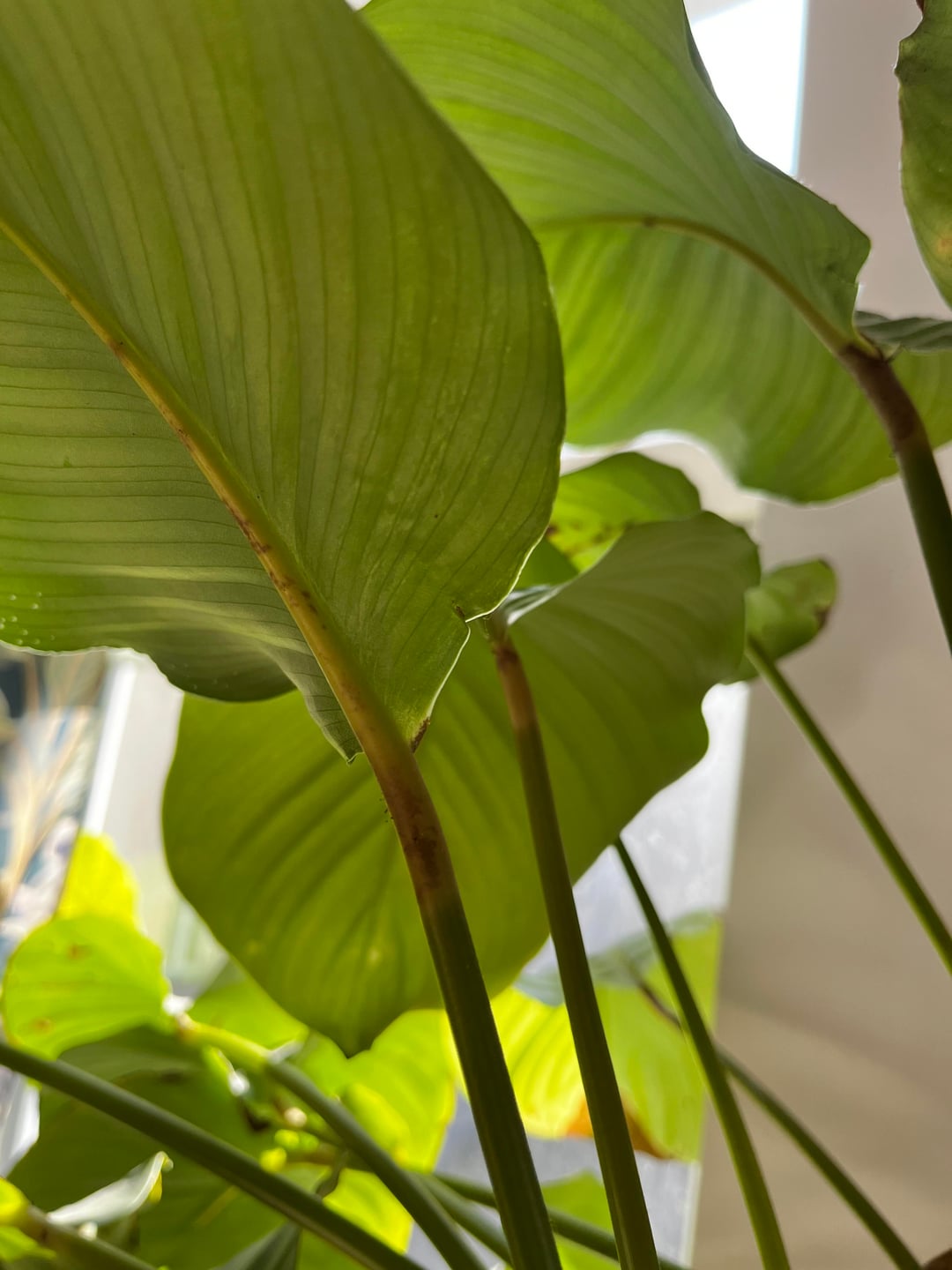 今日、じっくり観察してびっくりしました。私の植物に何が起こっているのか。まだ修正できますか?茶色の斑点のない葉が2枚ありますが、茎は少し茶色になっています-最後の写真。