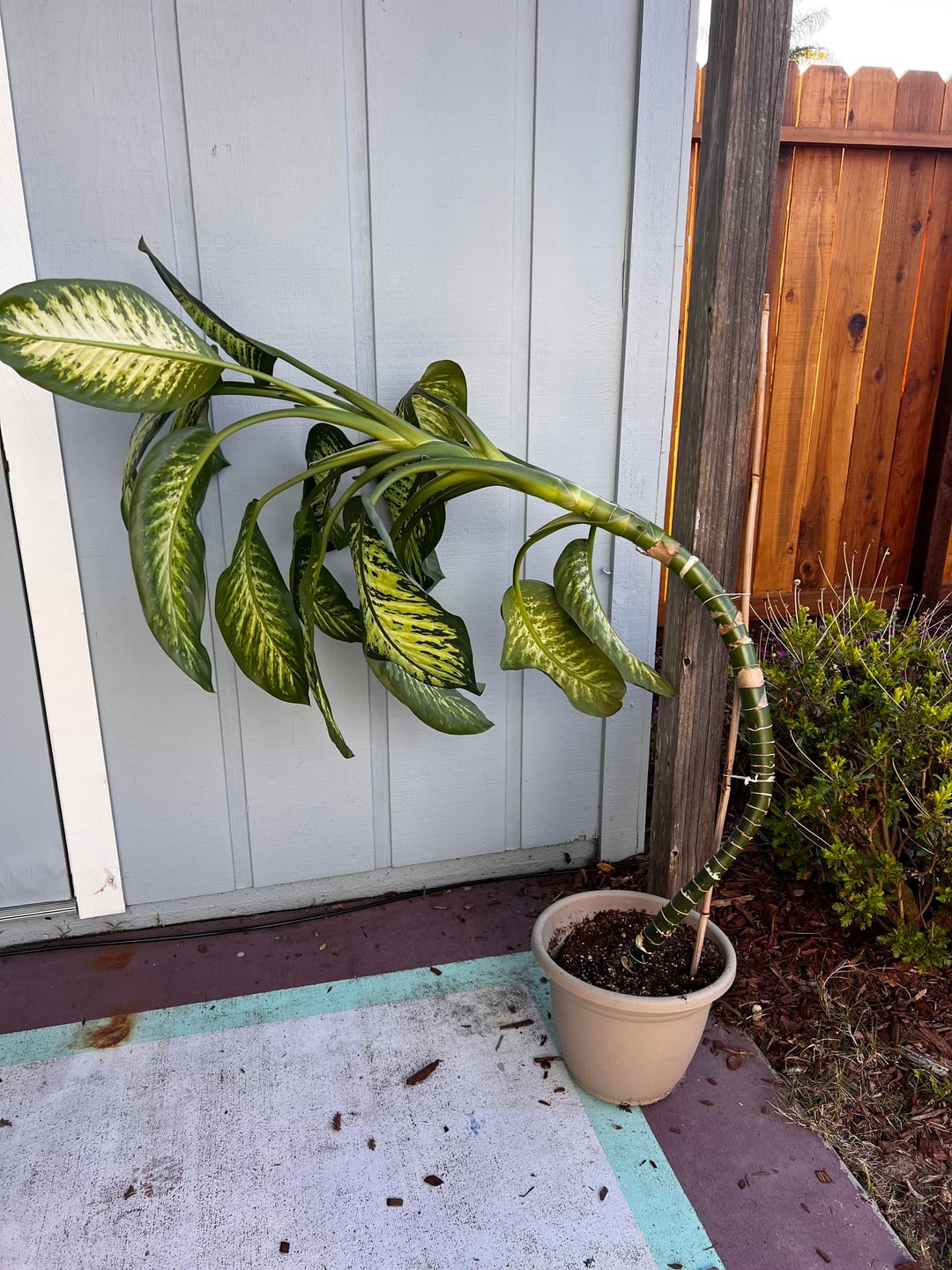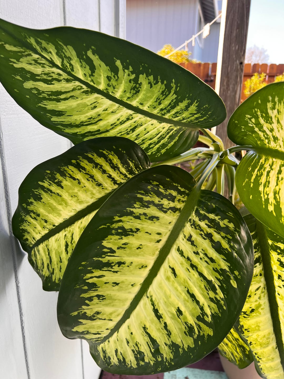 私は遺伝したディフェンバキア (少なくとも Google で調べたところそう呼ばれていると思います) を飼っていますが、ゆっくりと茎に対して大きくなりすぎています。私はトップの見た目が大好きで、確かに健康的ですが、脚の長い茎は好きではありません。普段は日当たりの良い南向きの部屋に住んでいます。