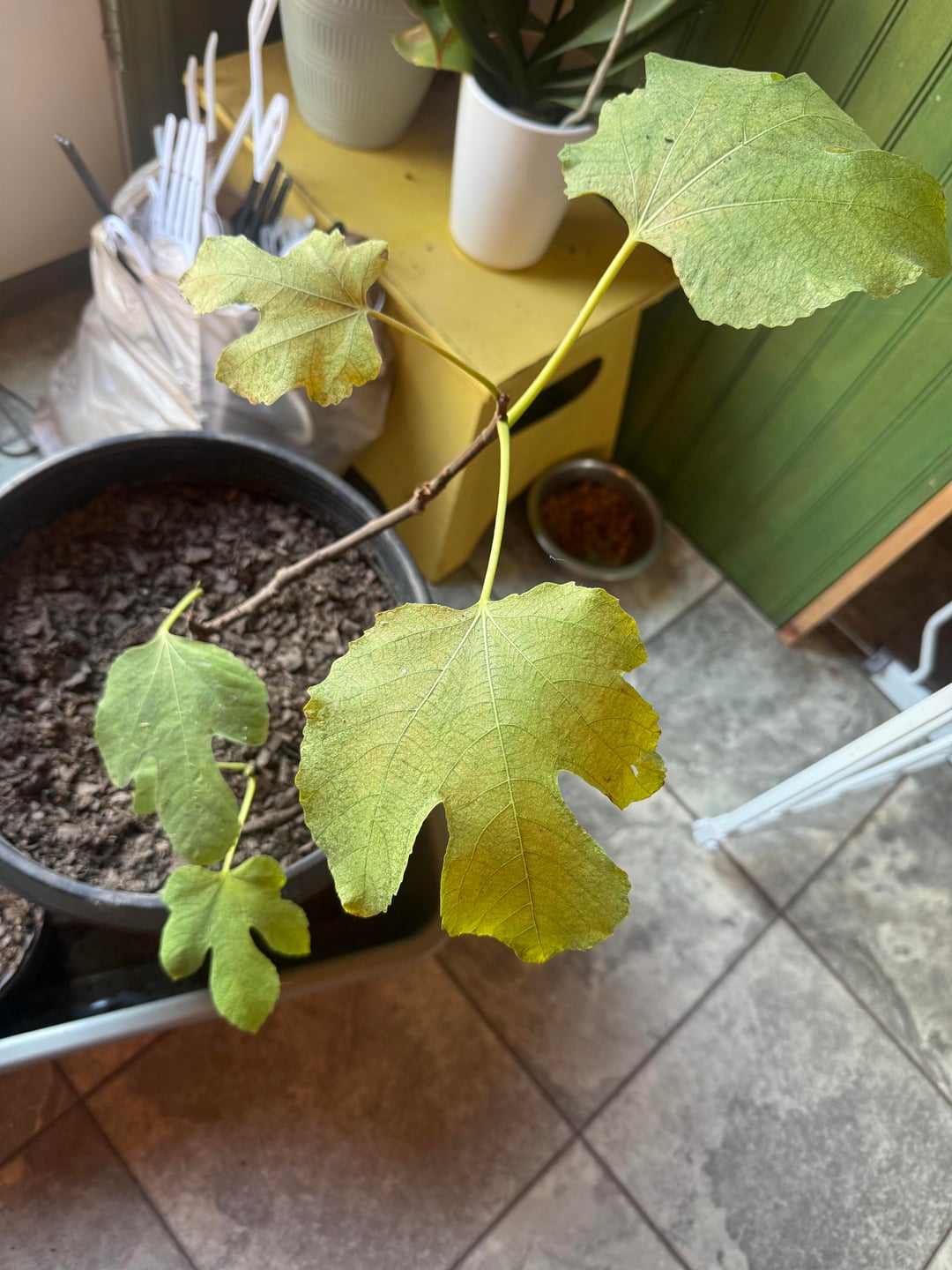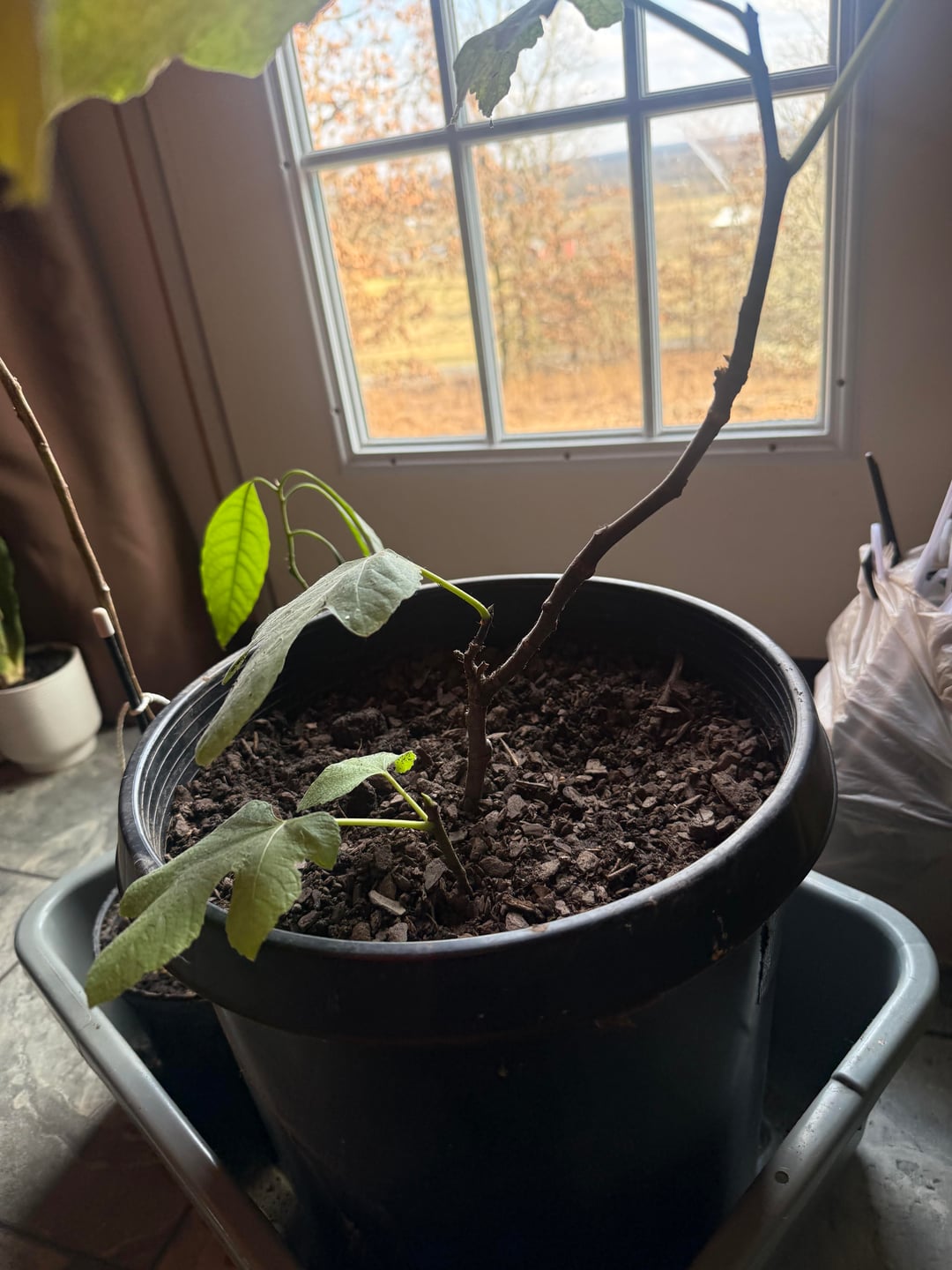 このイチジクの木を植え替えたところ、主幹の隣に新しい芽が生えてきました。放っておけばいいのでしょうか?そして、それらの大きな葉が 2 つ少し茶色くなってきていますが、それは心配ですか?