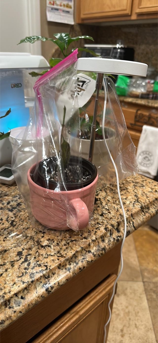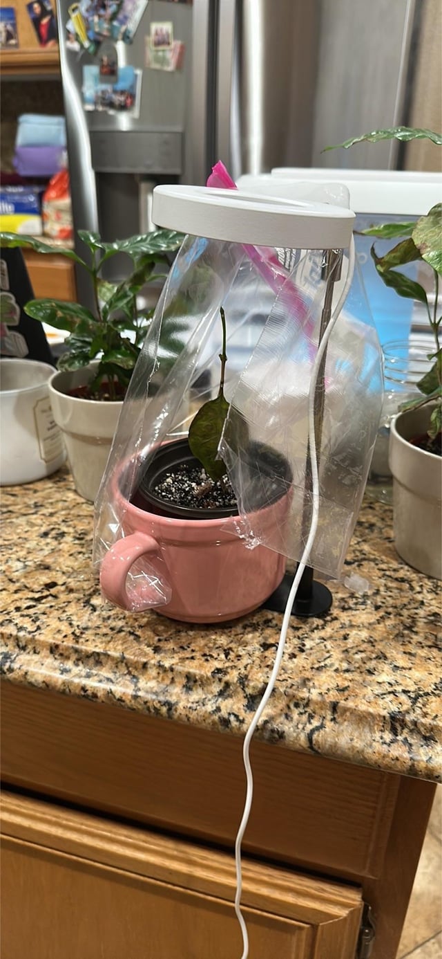 彼女はコーヒーです 彼女は開いたジップロックの袋に入っていて、切り開いて彼女の三方を囲んでいるだけですが、彼女にはまったく触れていません ランプをスタンドとして使っていますが、まったく点灯しません とりあえず大丈夫ですか?月曜日には温室が到着します