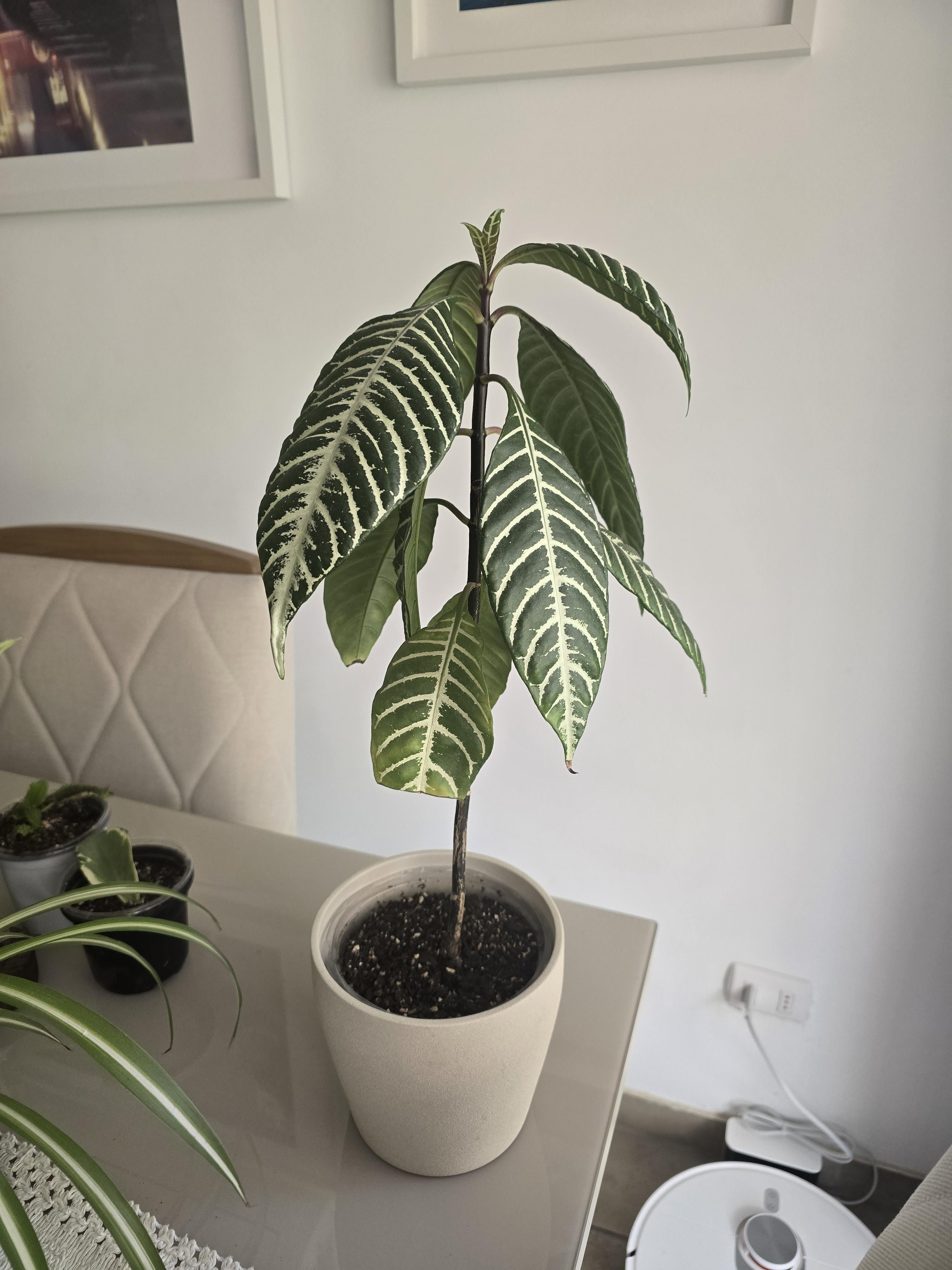 この植物をどうするか決めていました。脚が長すぎて見栄えが悪く、トップヘビーになってきています。おそらく3つの部分に切って、根を張ってそれらを一緒にすべきでしょうか?裸の茎から根が伸びることを期待して、深めの鉢に植えることも考えました。