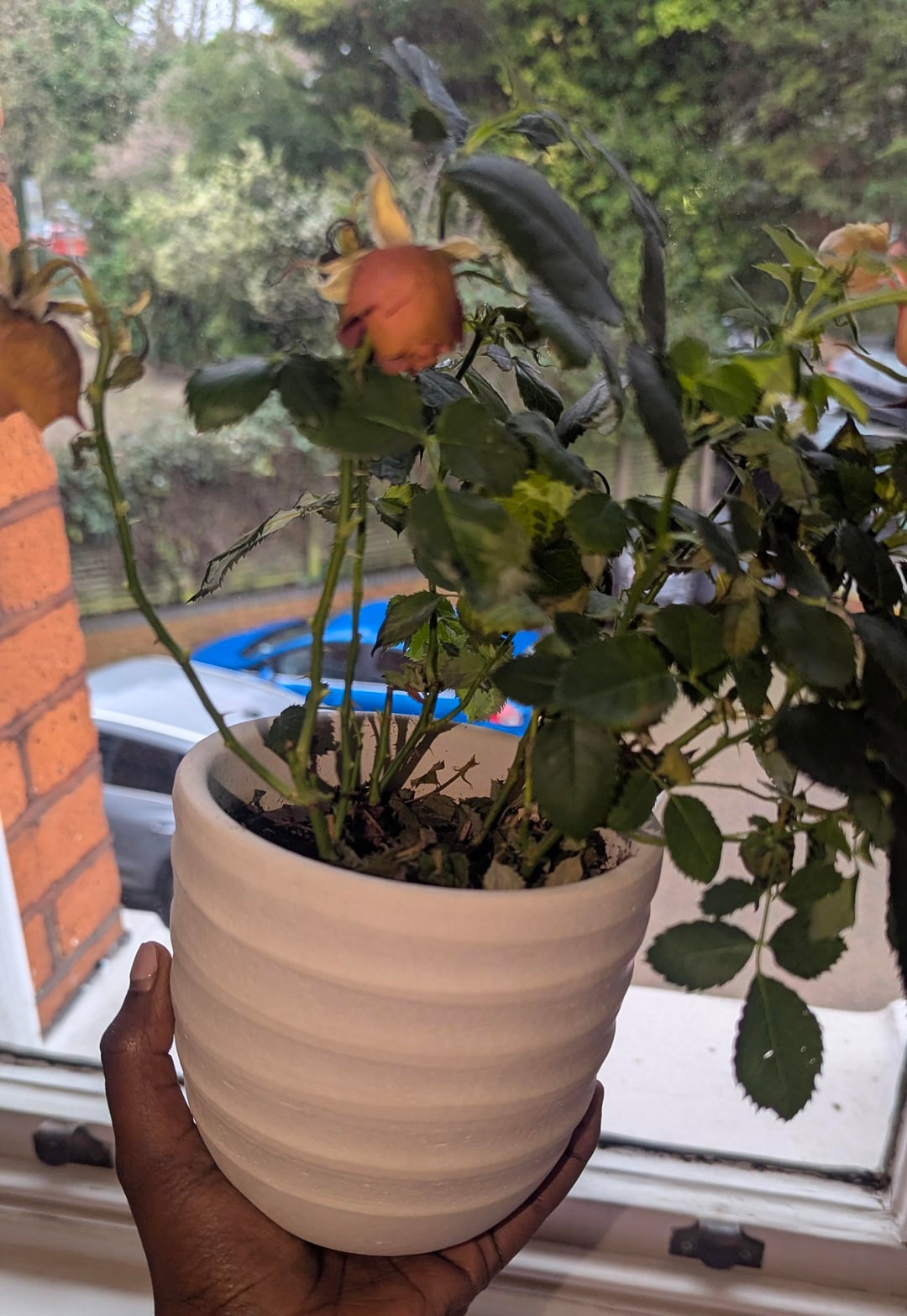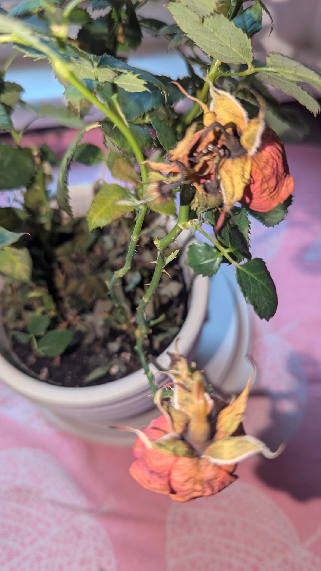 このミニバラを3週間ほど飼っています。春の日差しが降り注ぐ窓際に置いてあり、土を湿らせておくために毎日水やりをしています。最近、花が全部しぼんでしまい、下の葉が黄色や茶色に変色して落ち始めています。